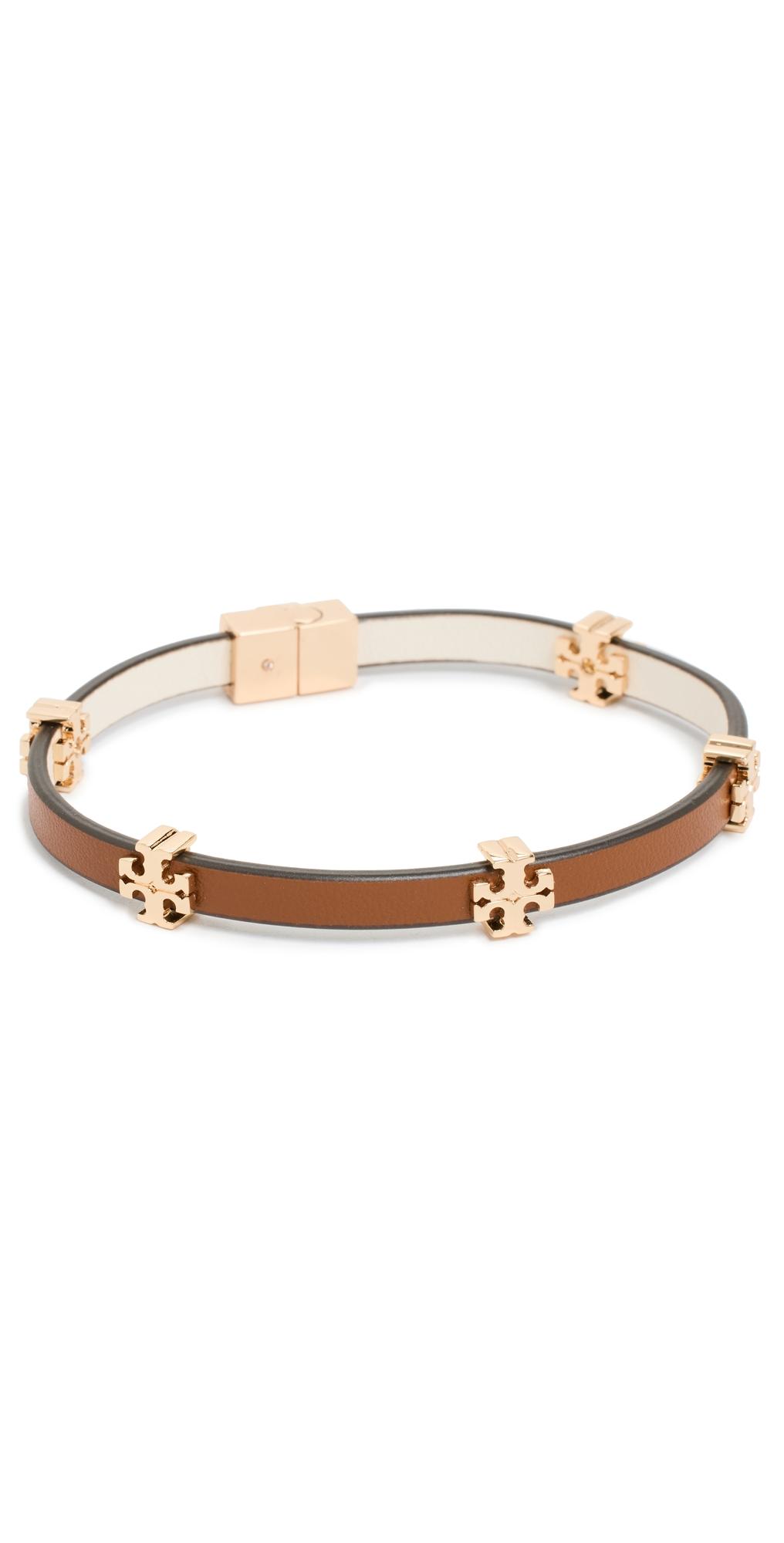 From the Eleanor Collection. Crafted of leather, Tory Burchs bracelet is studded with 18K-gold-plated logo charms. A petite round cubic zirconia at the interior clasp adds a touch of shimmer to this eye-catching piece. Cubic zirconia Leather 18K-gold-plated brass Sliding bar clasp Imported SIZE Small/Medium: about 7.1L Medium/Large: about 7.8L ABOUT THE BRAND Since debuting her brand in 2004, New York-based designer Tory Burch has made an impact on the fashion world with her handbags and shoes, and playful-yet-polished clothing. Today, Burch remains inspired by color and travel, with her vibrant collections bursting with prints, and her instantly recognizable double-T logo drawing from Moroccan architecture. Fashion Jewelry - Trend Jewelry > Tory Burch > Saks Fifth Avenue > Barneys. Tory Burch. Color: Gold.