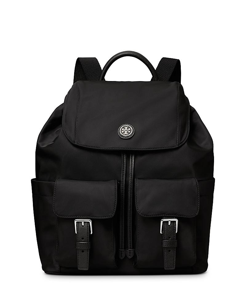 Chic and lightweight, the Tory Burch Virginia Flap Backpack has got you covered when you're on the go. Top carry handle and dual adjustable backpack straps. Cinch-top main compartment with magnetic flap closure. Magnetic snap-flap pockets with buckle detail at front wall. Vertical zippered pocket at back wall. Water bottle pockets at each side. Interior features one zippered pocket and one slip pocket. Holds up to 13 laptop. Imported. Measurements: Bottom Width: 9 1 2 in Middle Width: 9 1 2 in Top Width: 9 1 2 in Depth: 5 in Height: 12 1 2 in Strap Length: 29 in Strap Drop: 15 in Handle Length: 8 1 2 in Handle Drop: 3 in Weight: 1 lb 4 oz