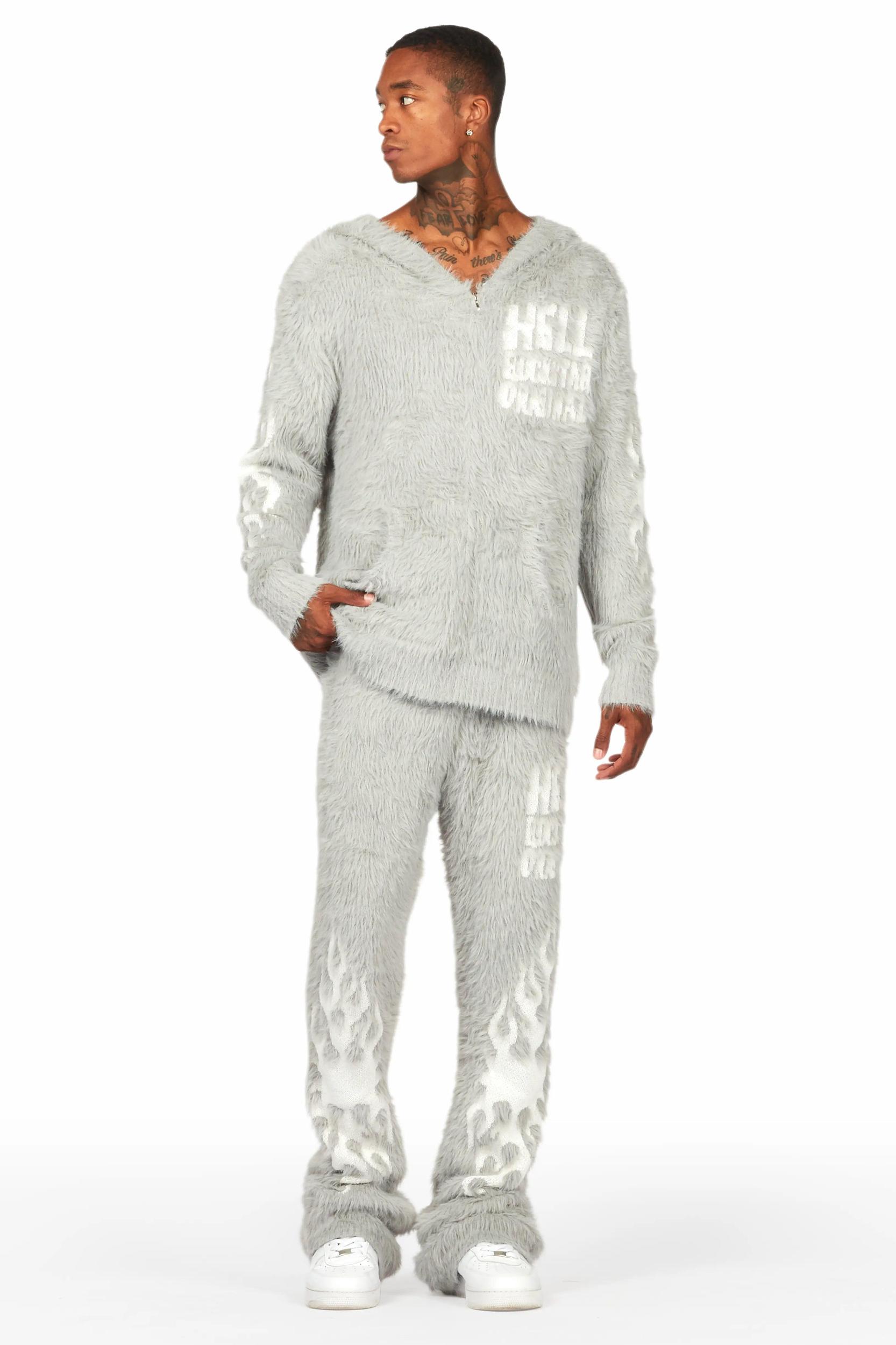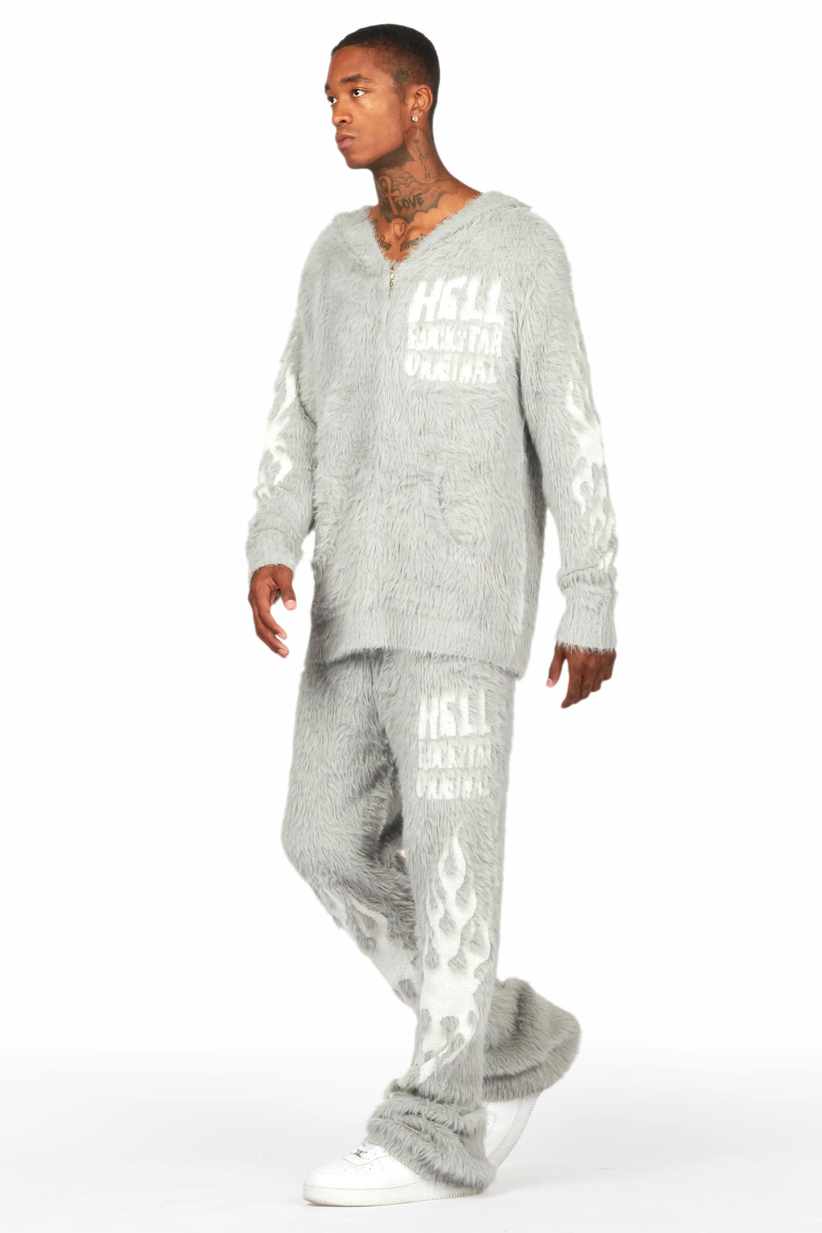 An urban two-piece zip-up jacket and track pant set for men in grey. Designed with ultra soft knitted fabric and extra long legs for a must-cop streetwear set. Hooded neckline Long sleeves Full front zip closure Dual slant pockets Ribbed knit trims Drawstring waistband Slant pockets Printed RSO logos Custom printed graphics Fuzzy knitted mohair fabric Stacked construction 35.75" seams *NOTE: These pants are purposefully designed with extra long legs so the fabric properly bunches at the hem, creating the stacked flare style.