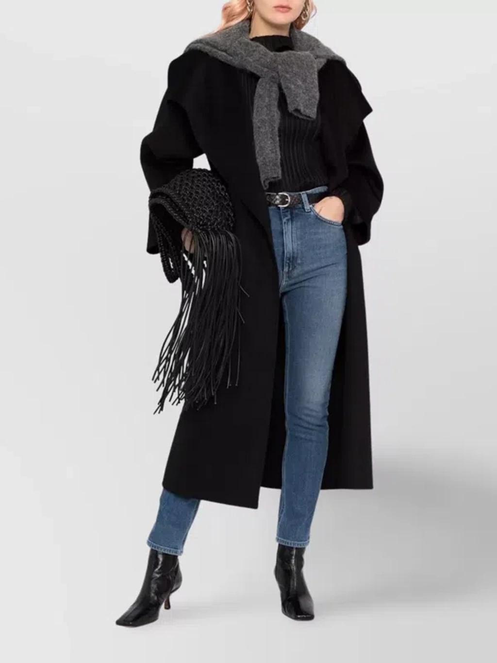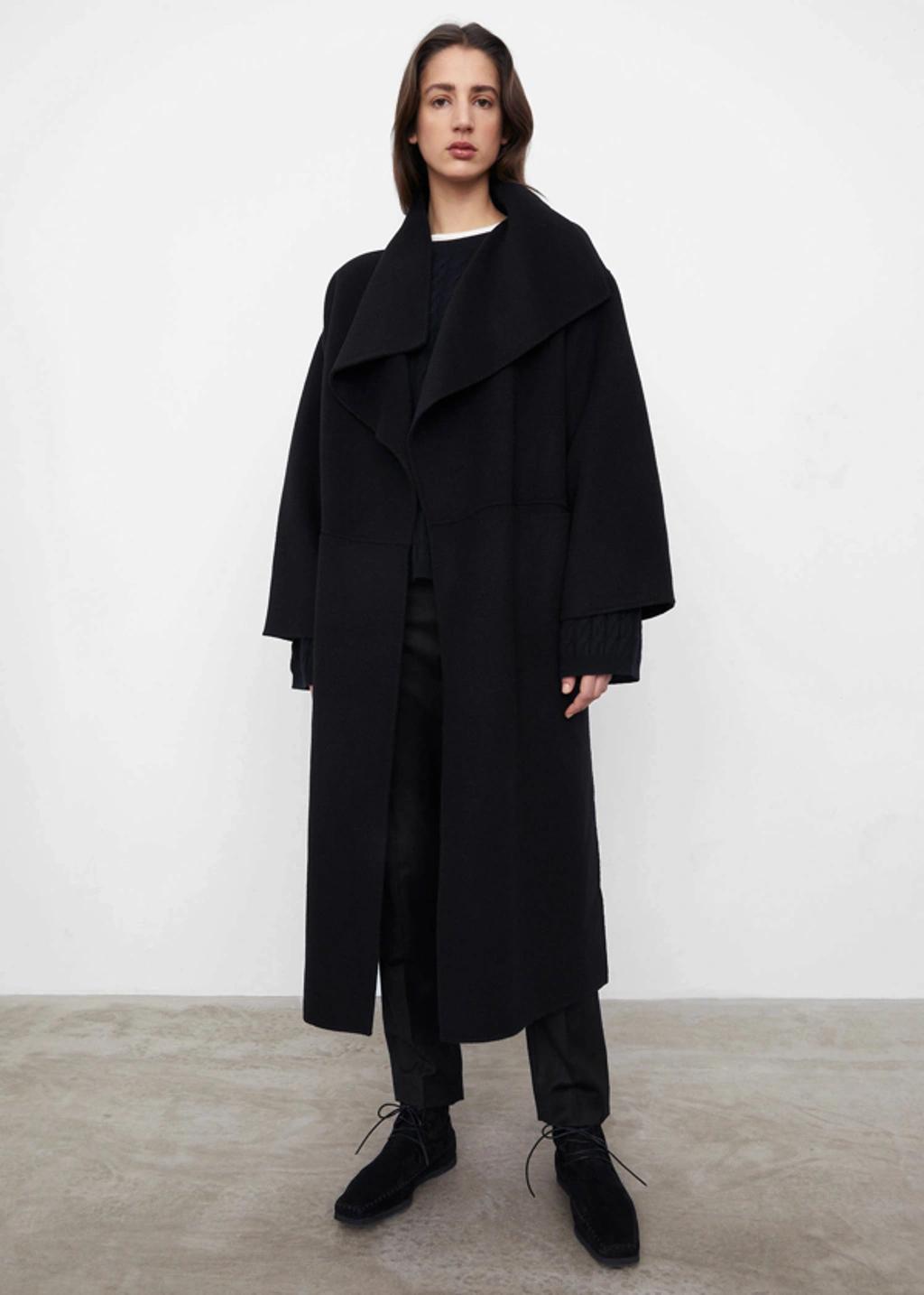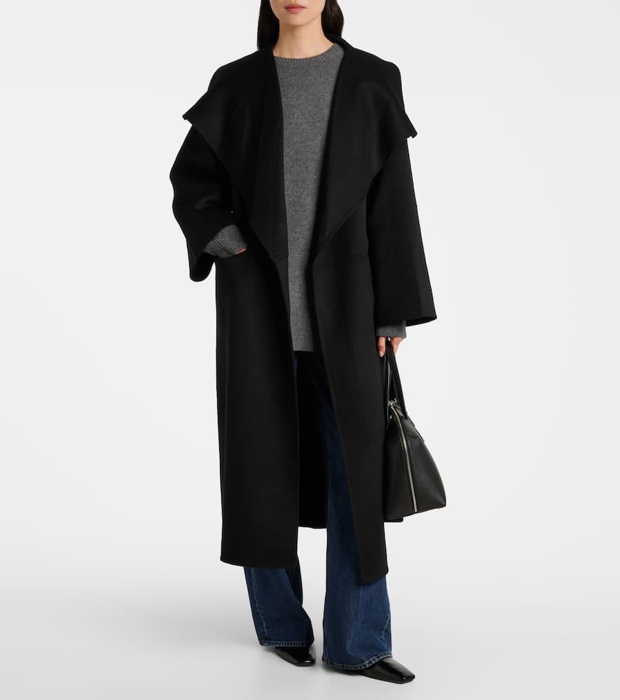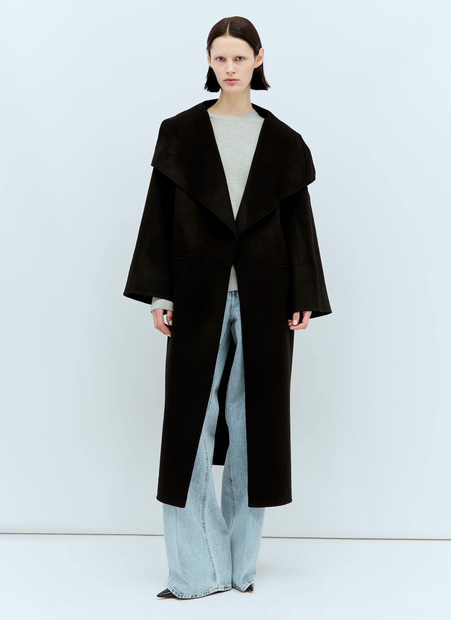 Shop Totême Toteme Signature Wool And Cashmere Coat In Black from 800+ stores, starting at $1032. Long sleeve brushed wool and cashmere-blend coat in black. Shawl collar. Open front. Welt pockets at waist. Vent at side-seams. Unlined.Supplier color: Black