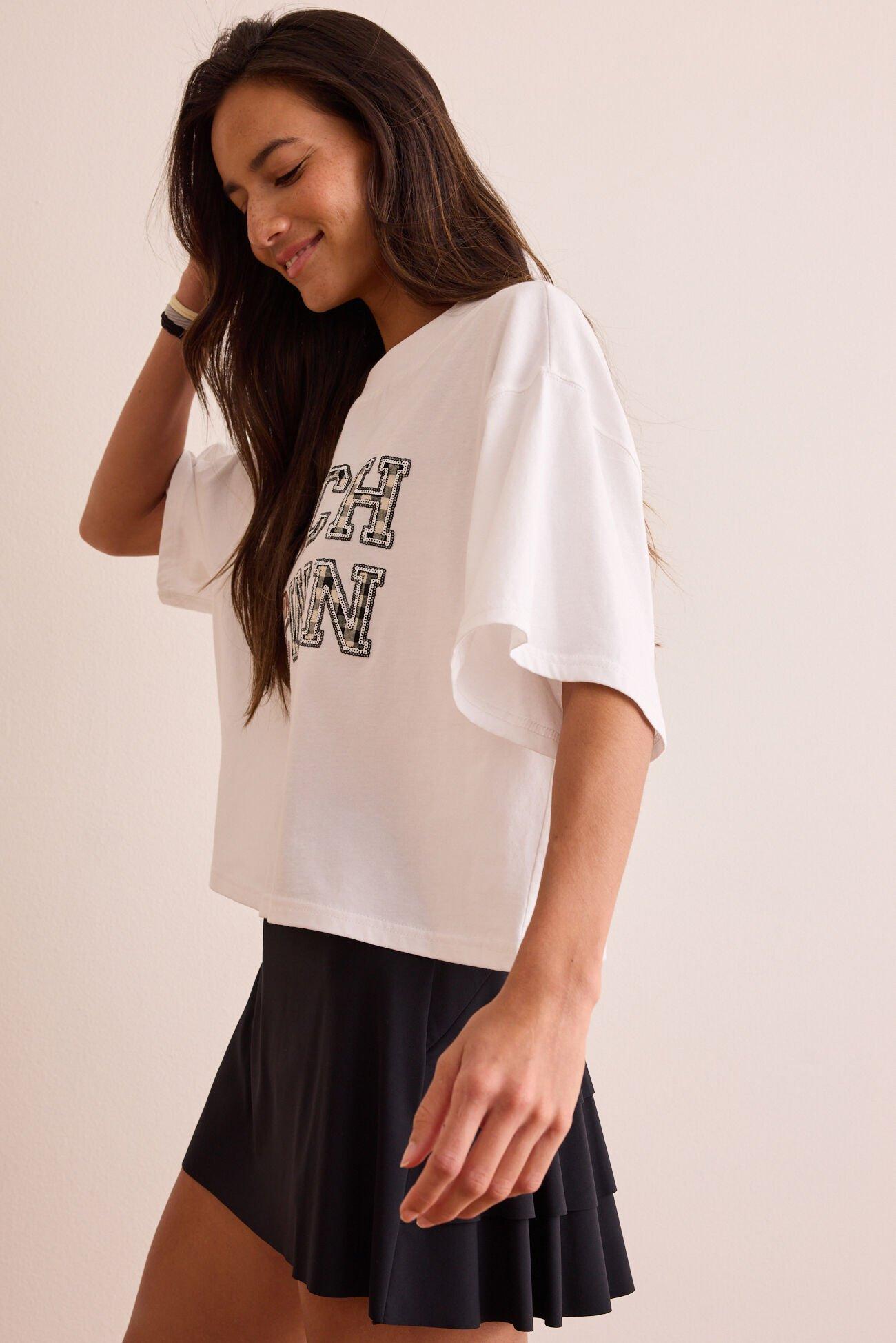 This graphic tee brings cute, sporty vibes to every football-filled weekend. Its boxy shape and laid-back fit make it an easy go-to for cheering on your team in style.