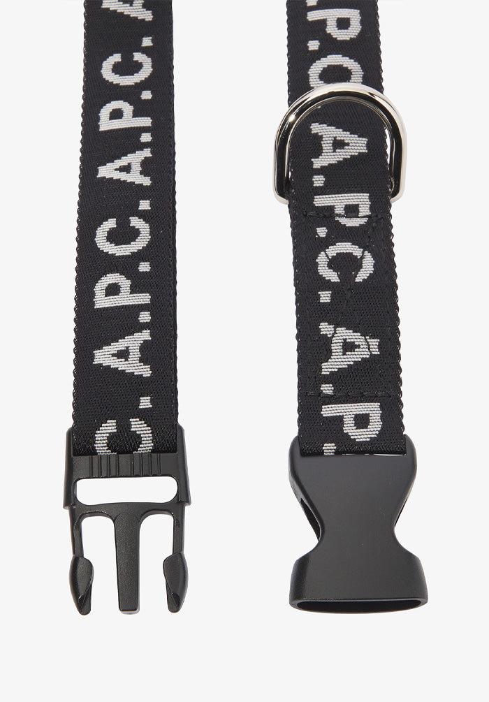 - Strong material. - Adjustable with a sliding buckle. - Closes with a black clip. - A silver metal ring to attach the leash. - A.P.C. logo all around the collar.