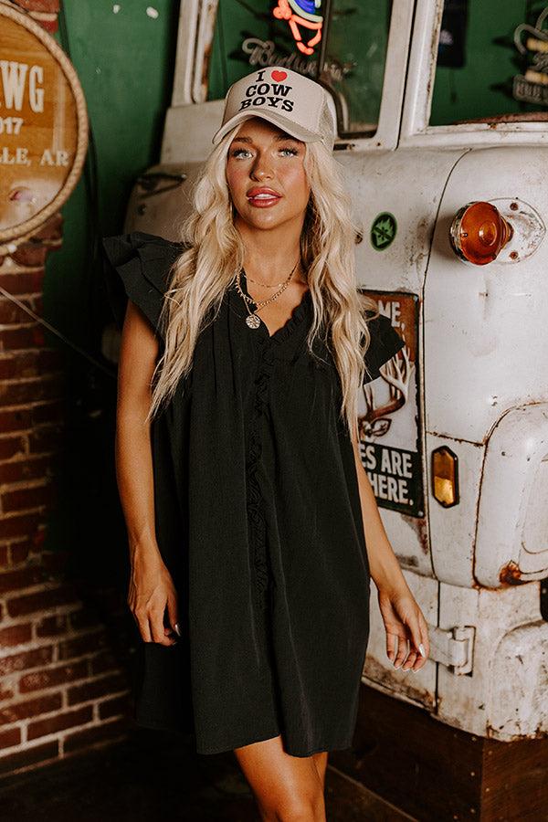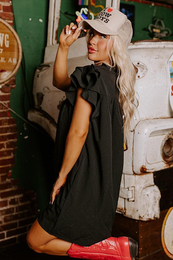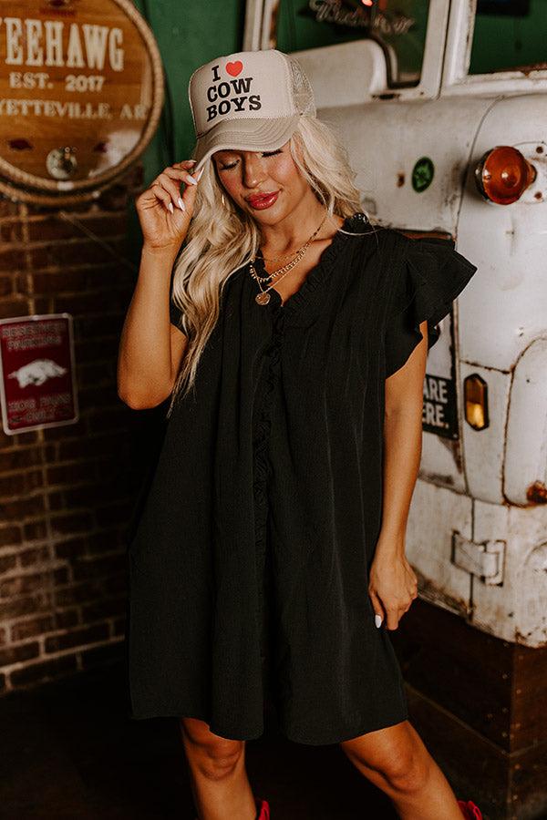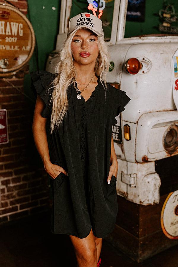 - This cutie has the stylish versatility to be dressed up or down! - Lightweight material with a built-in lining - A ruffled v-cut neckline - Hidden button-up closure in the front - A pleated bodice - Short ruffle sleeves - Hidden side pockets - A relaxed shift dress silhouette that ends in a mid-thigh length hemline