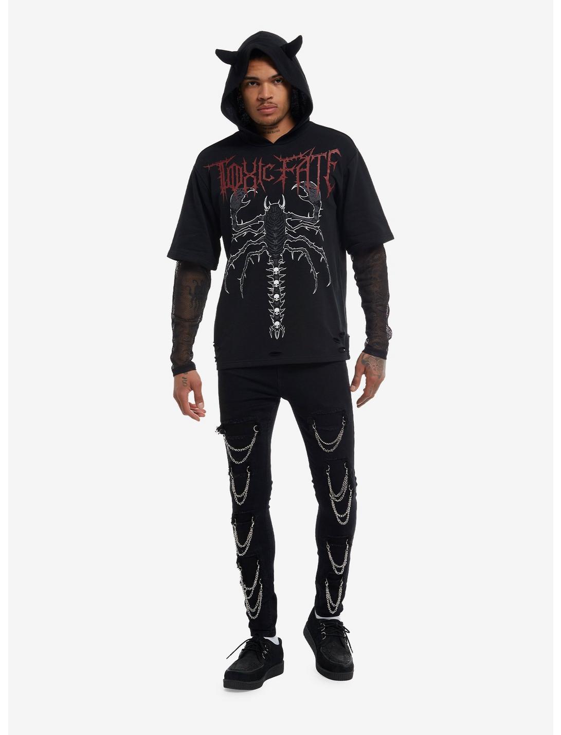 This twofer hoodie has short sleeves with mesh long sleeves underneath, plus figural plush horns on the hood. The front has a jumbo graphic of an alien-esque scorpion with skulls on its tail, and the words "Toxic Fate" written in red jagged font. There's distressing near the bottom hem.55% cotton; 45% polyesterWash cold; dry lowImportedListed in men's/unisex sizesModel is 5'9"Model wears size Medium