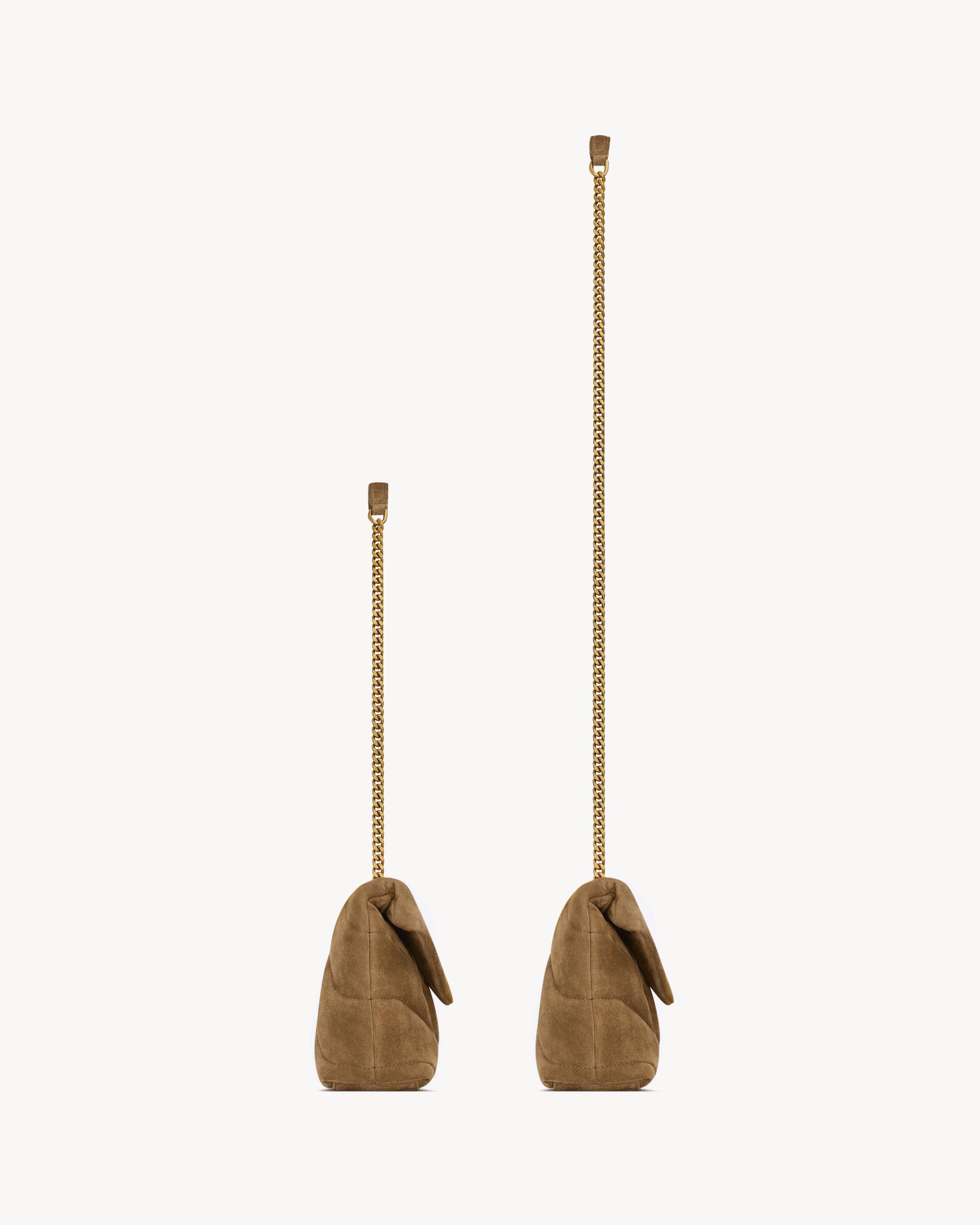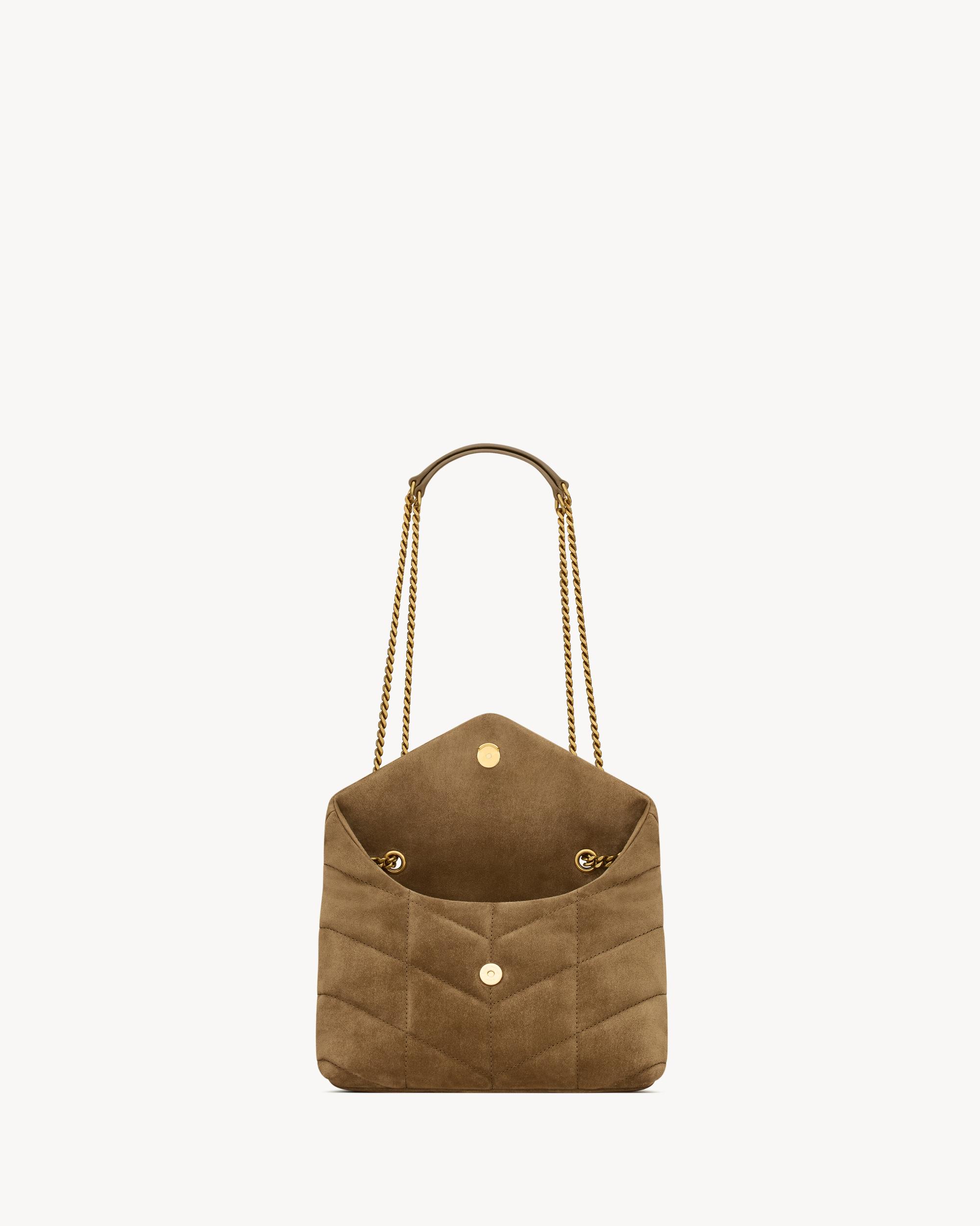 The mini version of the iconic LOULOU puffer, in suede with chevron quilting.The bag features a sliding chain strap for shoulder or crossbody carry.