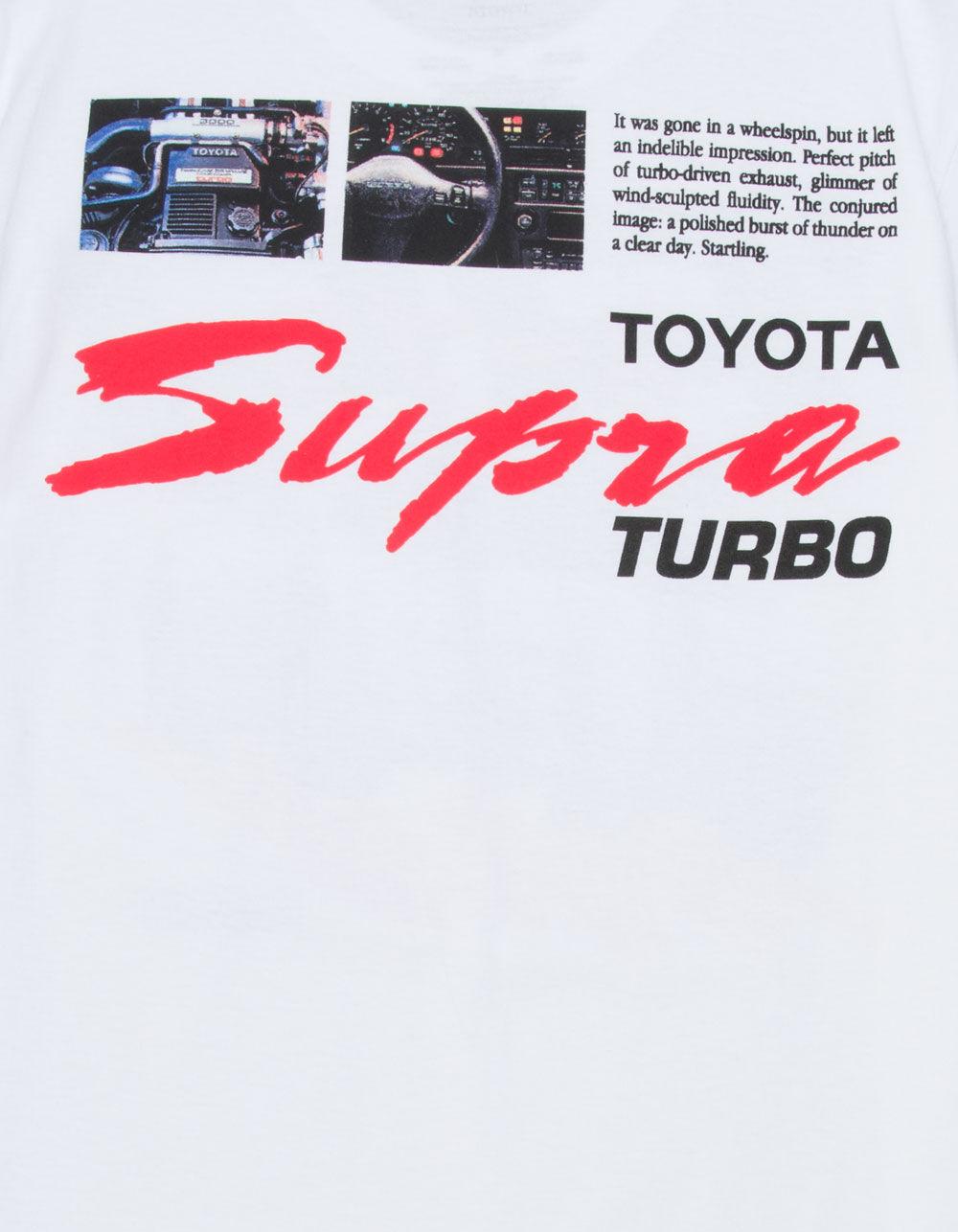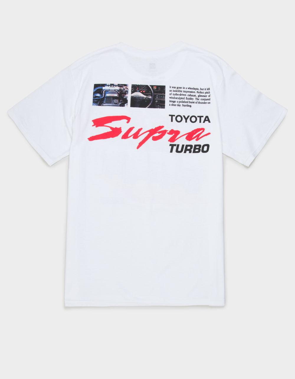 Toyota Supra Tee. Large graphic screened on front. Large graphic on back. Crew neck. Short sleeve. 100% Cotton. Machine wash. Imported.