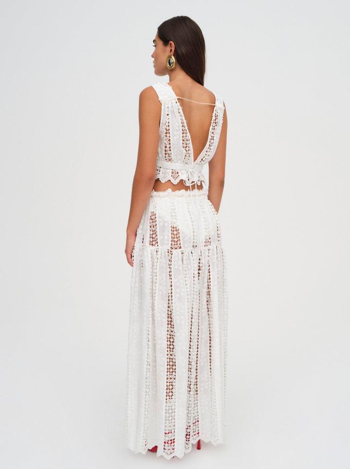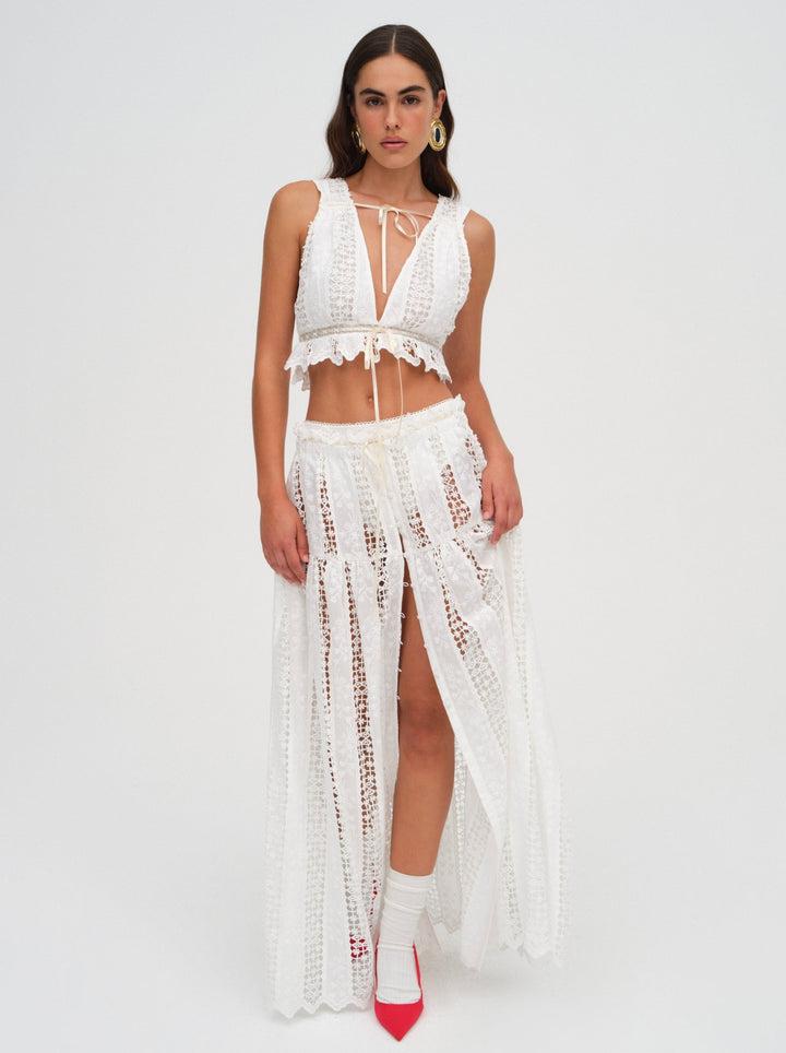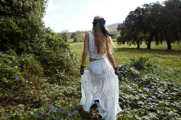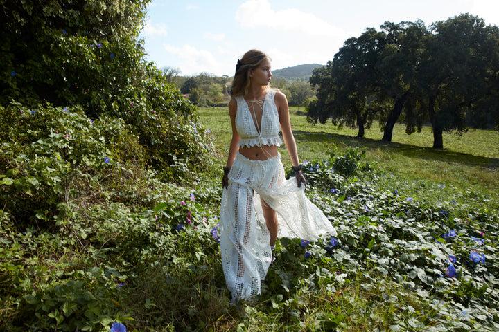 Run barefoot in the Tracy white maxi skirt—a paneled eyelet skirt with a slotted lace and ribbon trim, plus infinite bohemian flair. Pair it with the matching Tracy Top for a romantic co-ord set.
