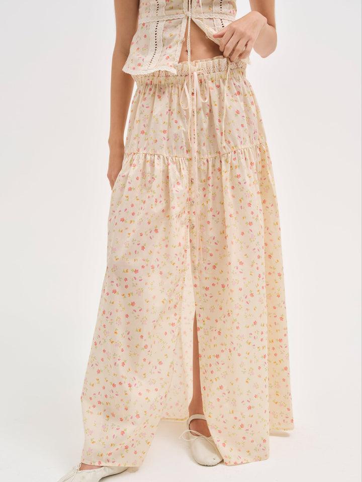 Stop and smell the flowers in the Tracy floral maxi skirt–a light yellow maxi skirt that spotlights a ruched drawstring waistband and a charming button down open front.