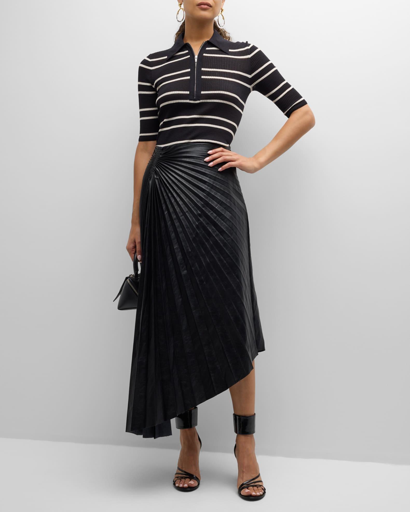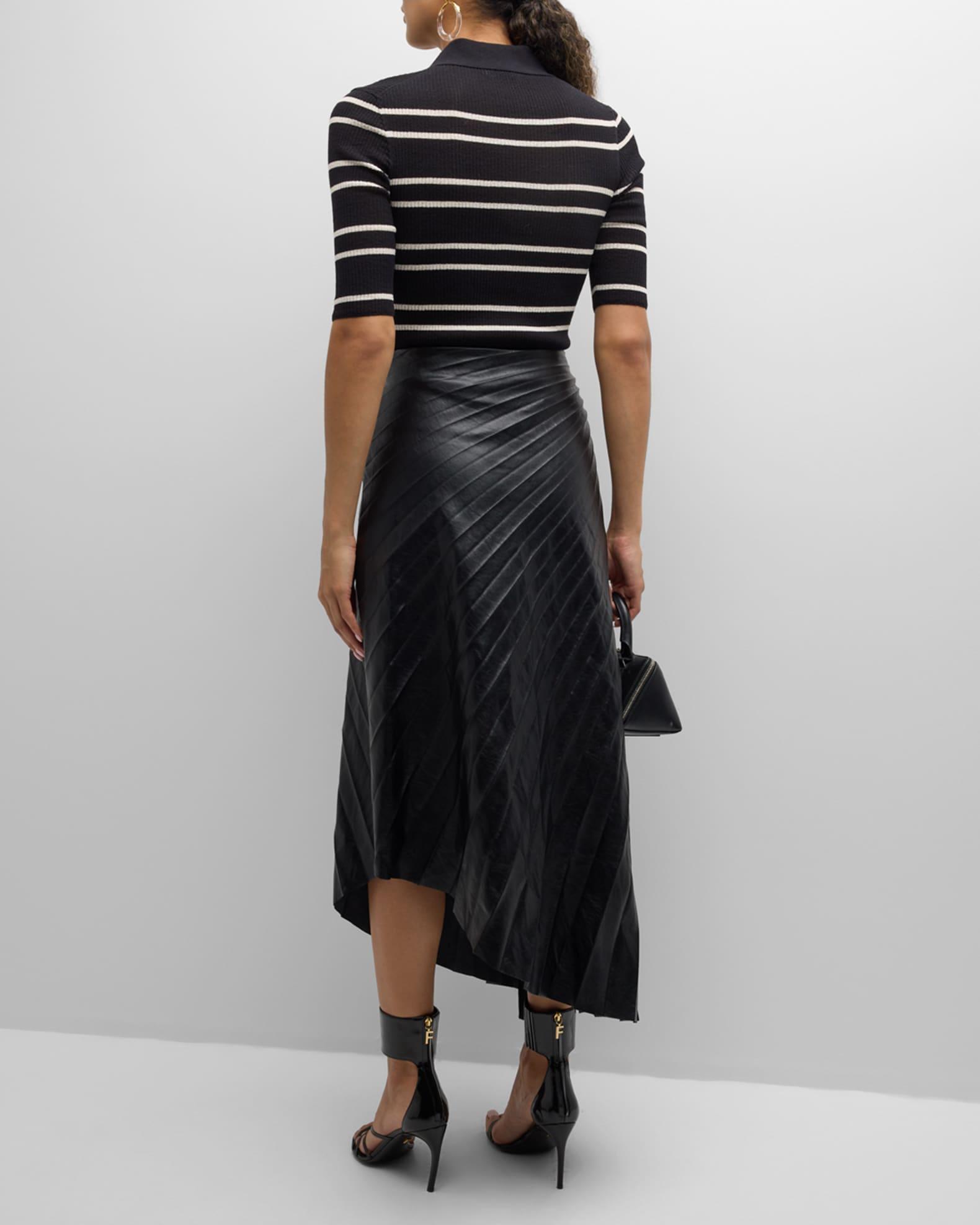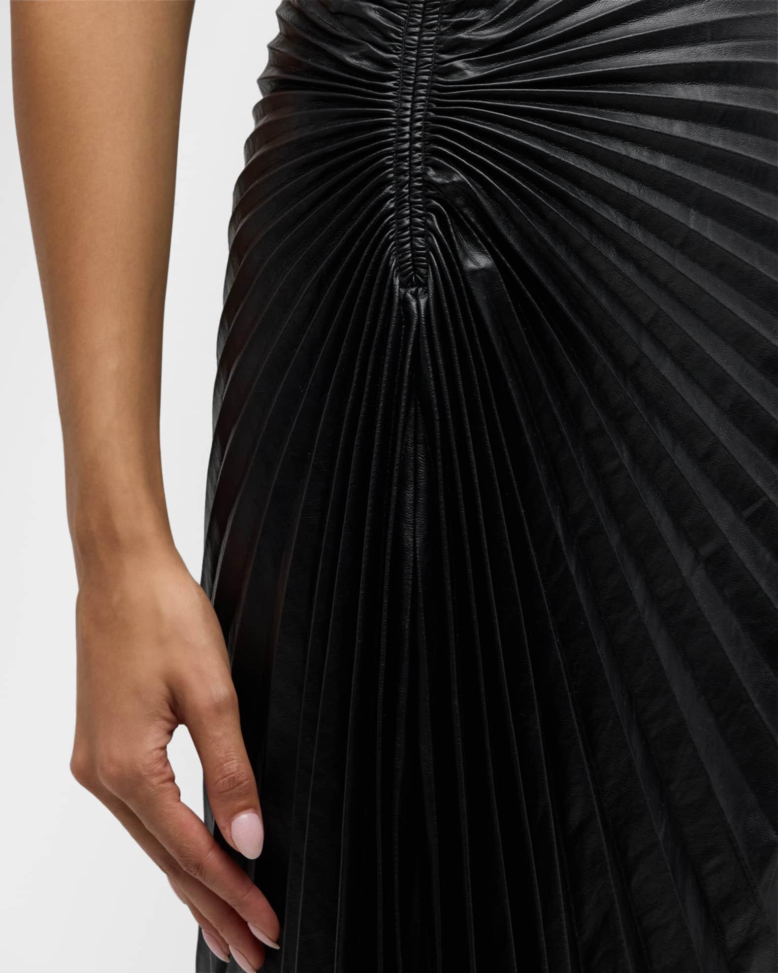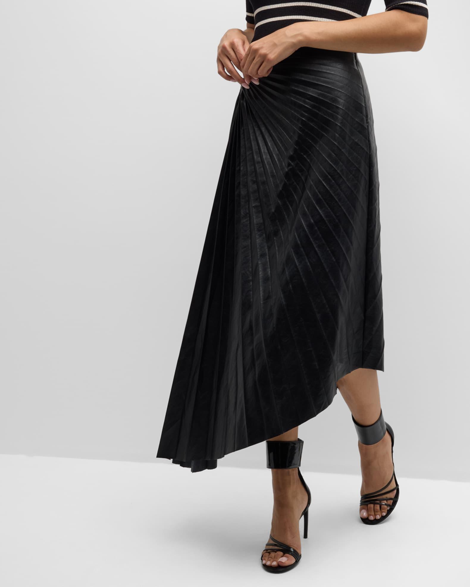 A.L.C. "Tracy" faux-leather midi skirt with gathering at one side finished with pleating High rise A-line silhouette High-low hem Viscose/polyester/cotton Lining: Elastane/polyurethane Dry clean Imported Size Note: Item runs small, consider ordering a size up.