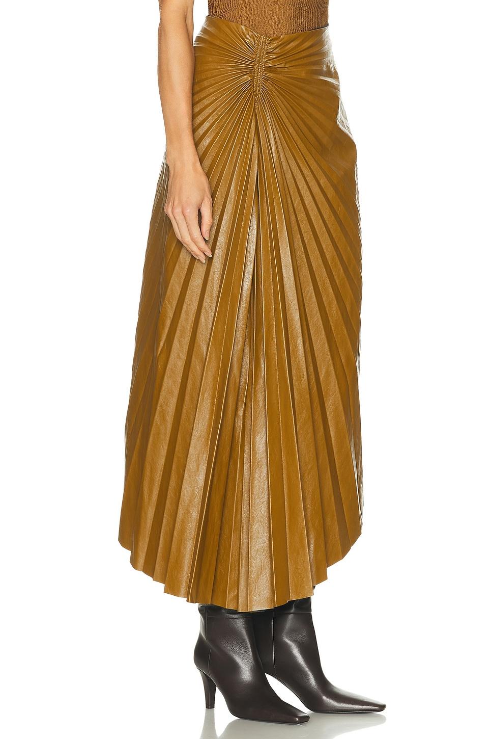 midi skirtSelf 1: 75% viscose, 14% polyester, 7% cotton, 4% metal coatingSelf 2: 100% polyurethane / Dry clean only / Unlined / Hidden side zipper closure / Faux leather pleated design with asymmetrical hem / Made in China / Our Style No. ALC-WQ91 / Manufacturer Style No. 3SKRT00478 / Model is wearing size 2.