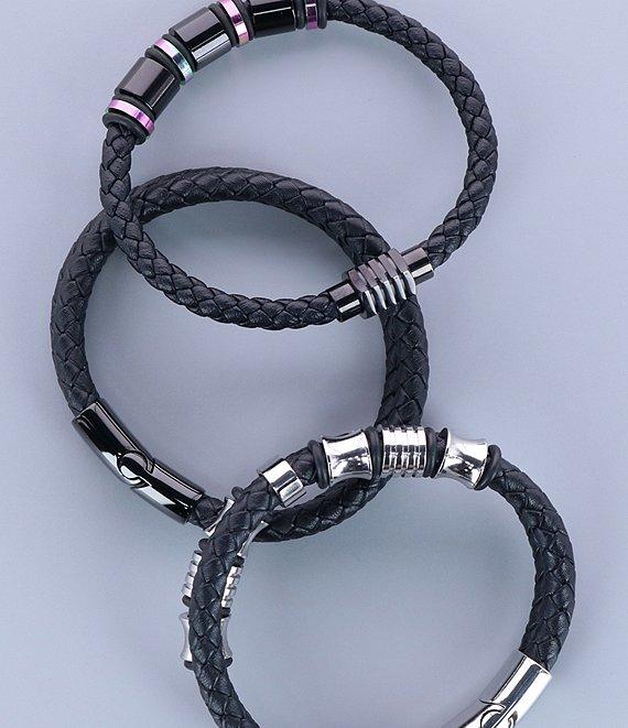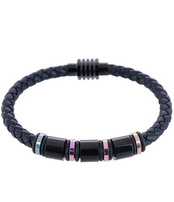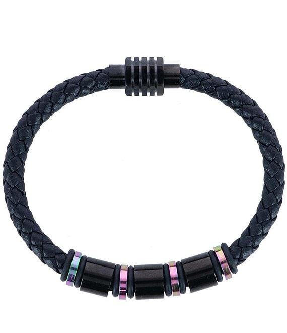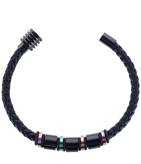 From Trafalgar, this bracelet features:Features a single strand of braided leatherDesigned to fit wrists up to 8 inches wideFeatures black embellishments with pops of subtle multicolored ringsPerfect for a distinguished gentleman of any ageAdd a little arm candy to your look and show off your personality while keeping it professionalMade of leather and metalImported.
