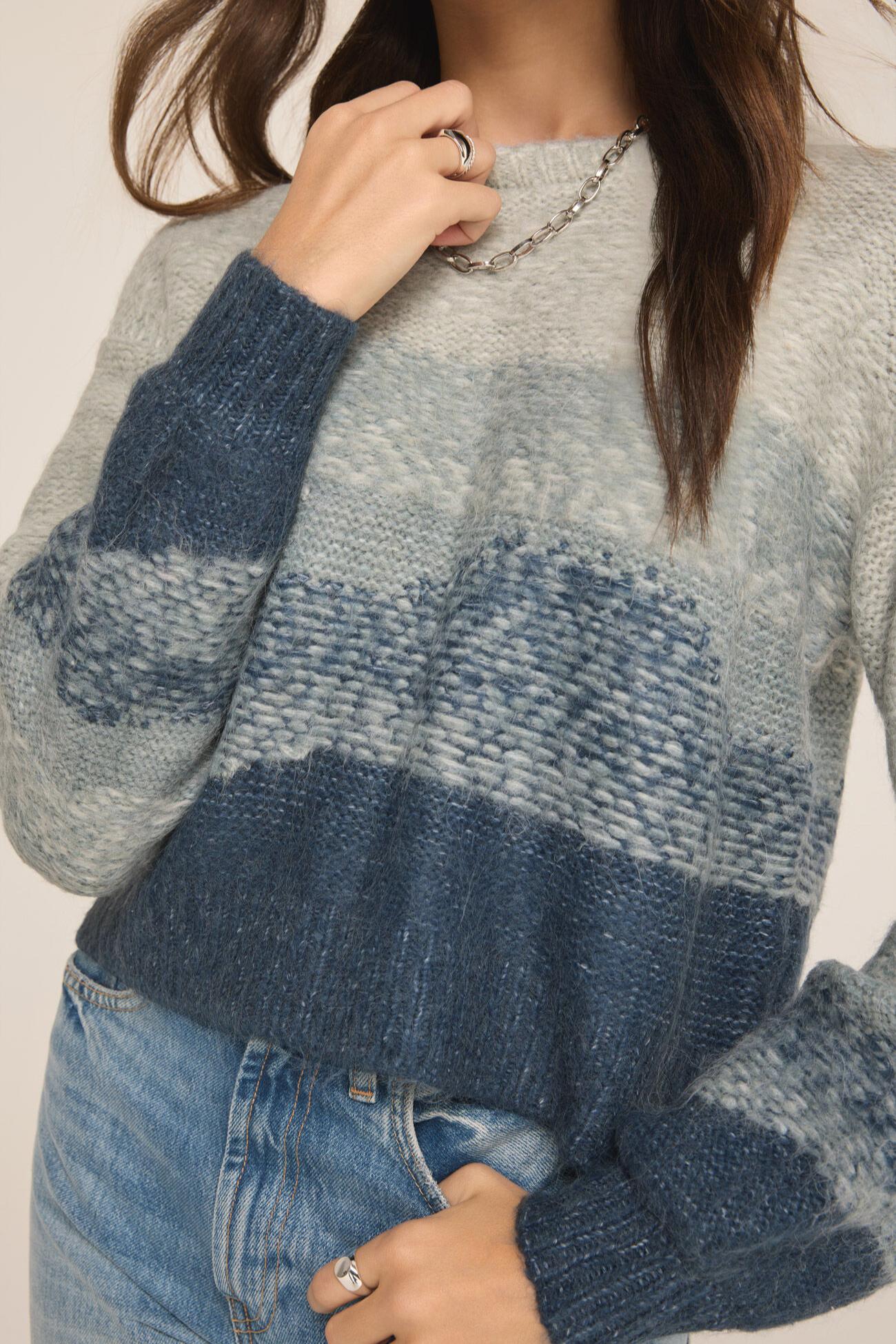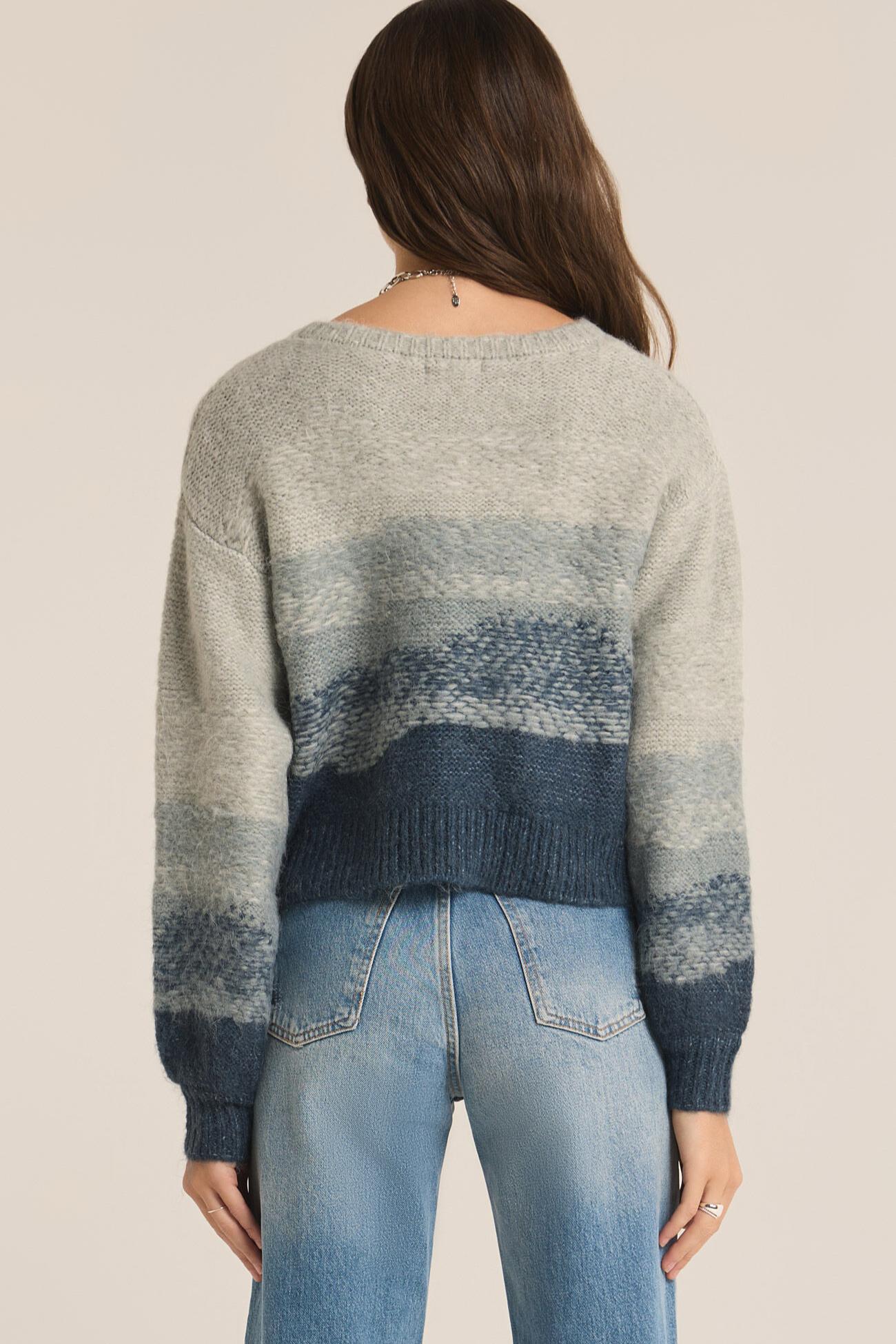 The Tranquil Waters Sweater features a crew neckline with a ombré pattern and full length sleeves. Pairs well with jeans!
