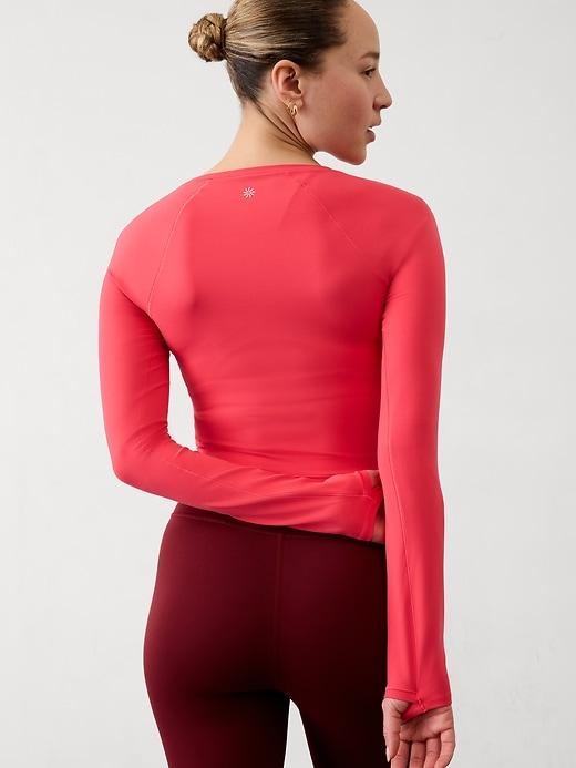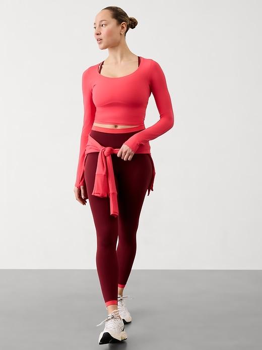 FOR: Yoga or studio practice FEEL: VITAFREE fabric with enhanced LYCRA® fiber is our lightest-feel yoga fabric for a barely there, yet fully covered sensation FAVE: Wide scoop neck inspired by prima-ballerina poise and power Thumbholes hold sleeves in place and keep warmth in #415288