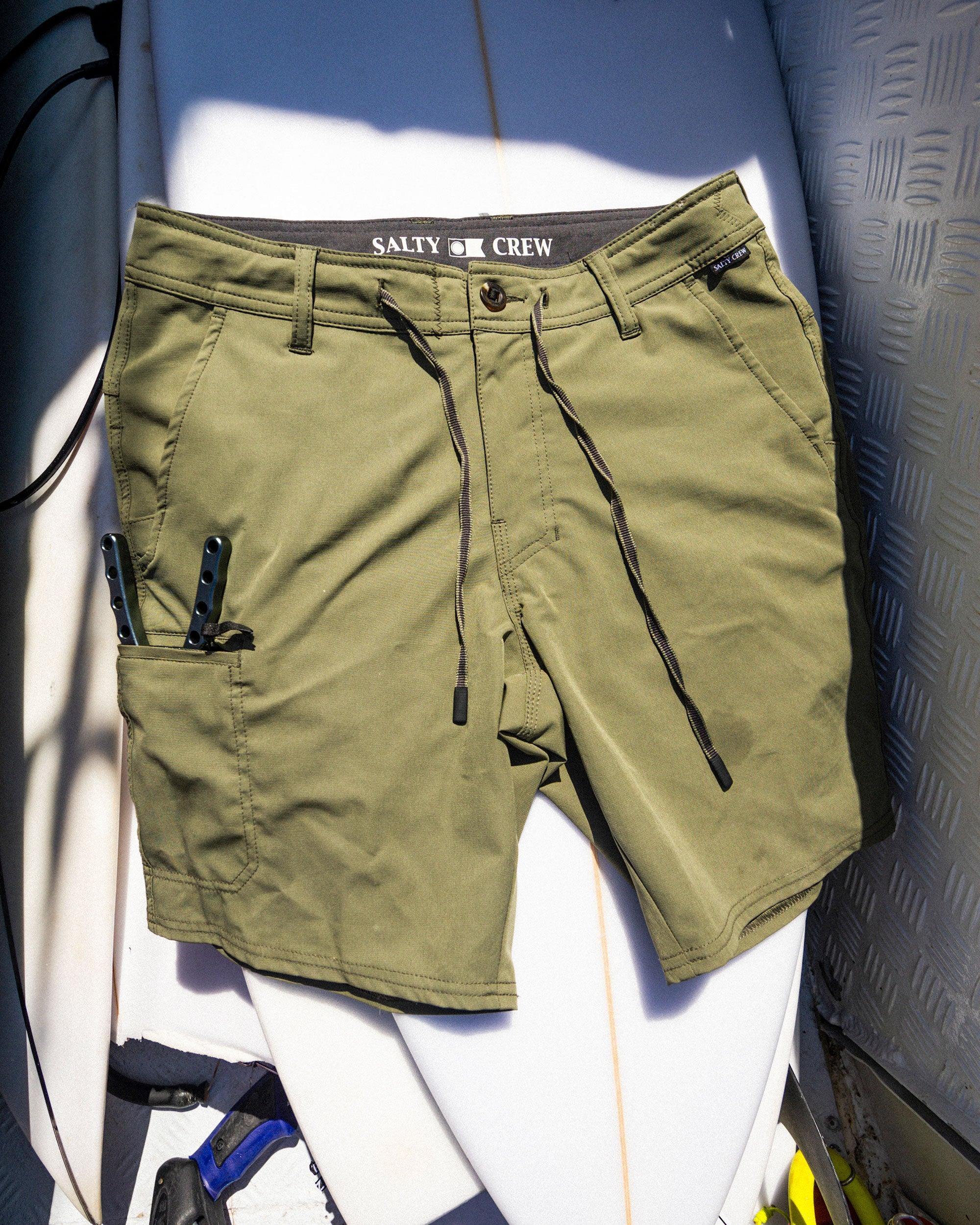 18 in Outseam 92% Recycled Poly 8% Elastane Performance light weight fibers 4-way stretch, quick dry fabrication Side hand pockets and back zipper pockets Lower right plier/ phone cargo pocket with zipper closure Interior/ exterior drawcord Zipper fly with button closure
