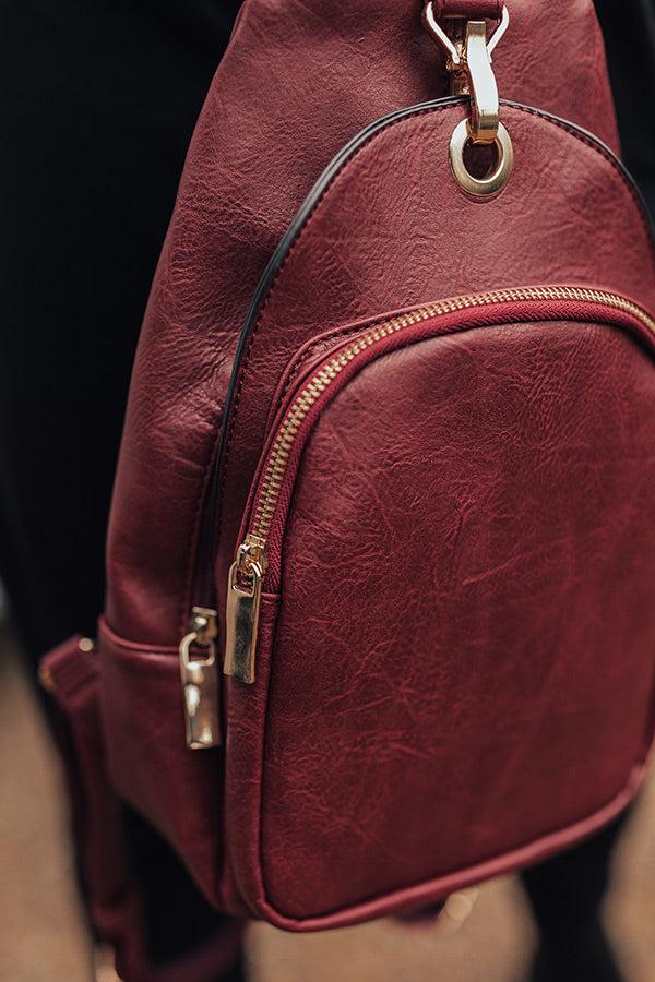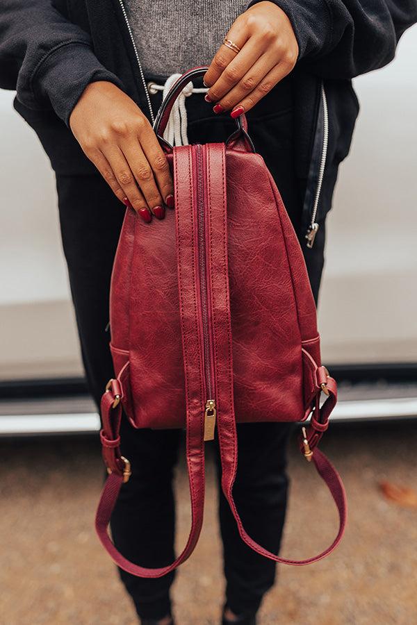 You won't find a better travel buddy than this cute wine colored backpack featuring sleek faux leather material, a single handle, two adjustable shoulder straps, and two spacious zip closure pockets!