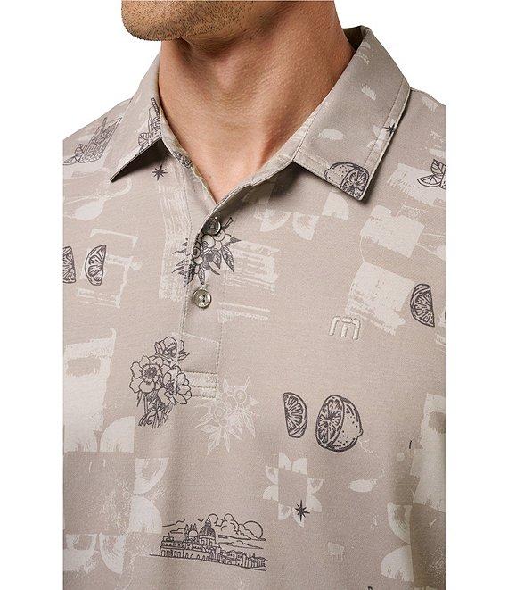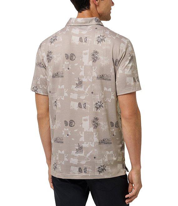 From TravisMathew, this polo shirt features: Stretch fabric Allover print Polo collar Short sleeves 3-button placket Pullover construction Classic fit Polyester/cotton/elastane Machine wash/tumble dry Imported.
