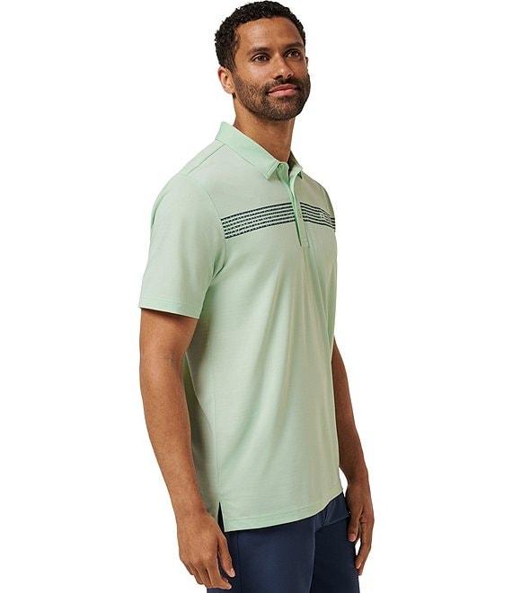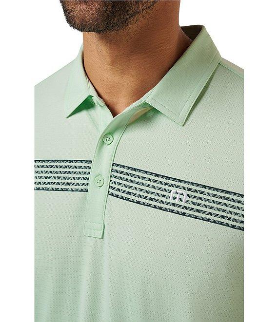 From TravisMathew, this polo shirt features: Chest stripe detail Signature, double-needle polo collar Built-in collar stays for the perfect shape Short sleeves 3-button placket Custom rubberized buttons Printed block logo on the back yoke Pullover construction Stretch fabric Polyester/elastane Machine wash/tumble dry Imported.