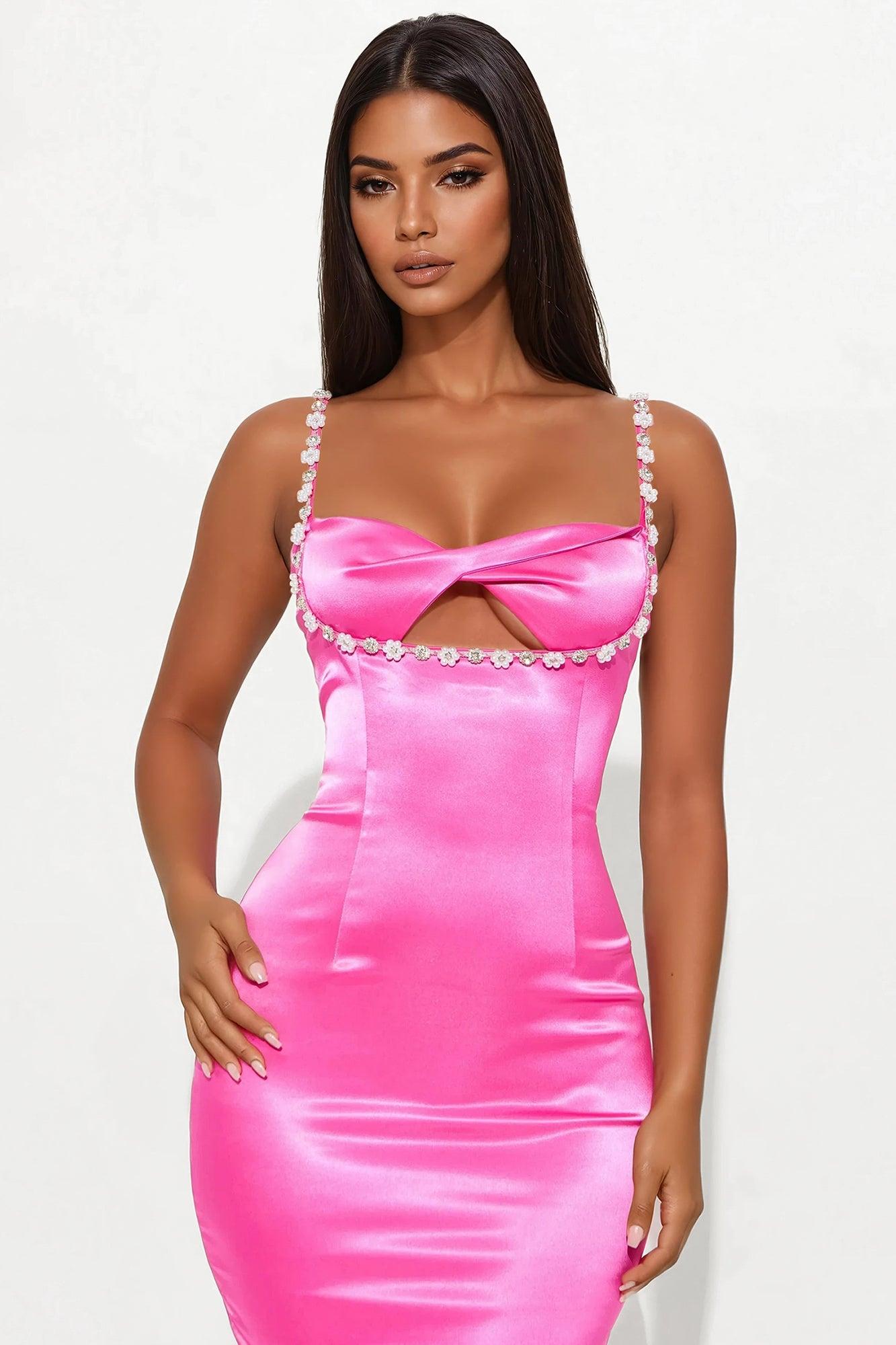 Available In Chartreuse And Hot Pink. Satin Midi Dress Sweetheart neckline Adjustable spaghetti straps Rhinestone trim Twist/knot detail Cut out Open back Back zipper Stretch Length measured flat = 45" Self: 90% Polyester 10% Spandex Imported California Proposition 65WARNING: Cancer and Reproductive Harm - www.P65Warnings.ca.gov.