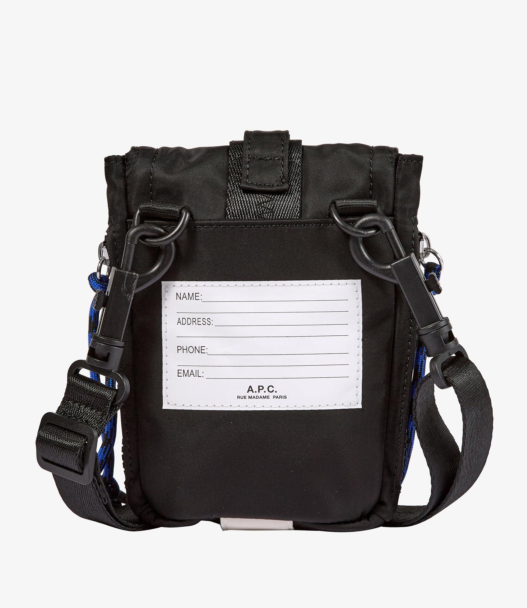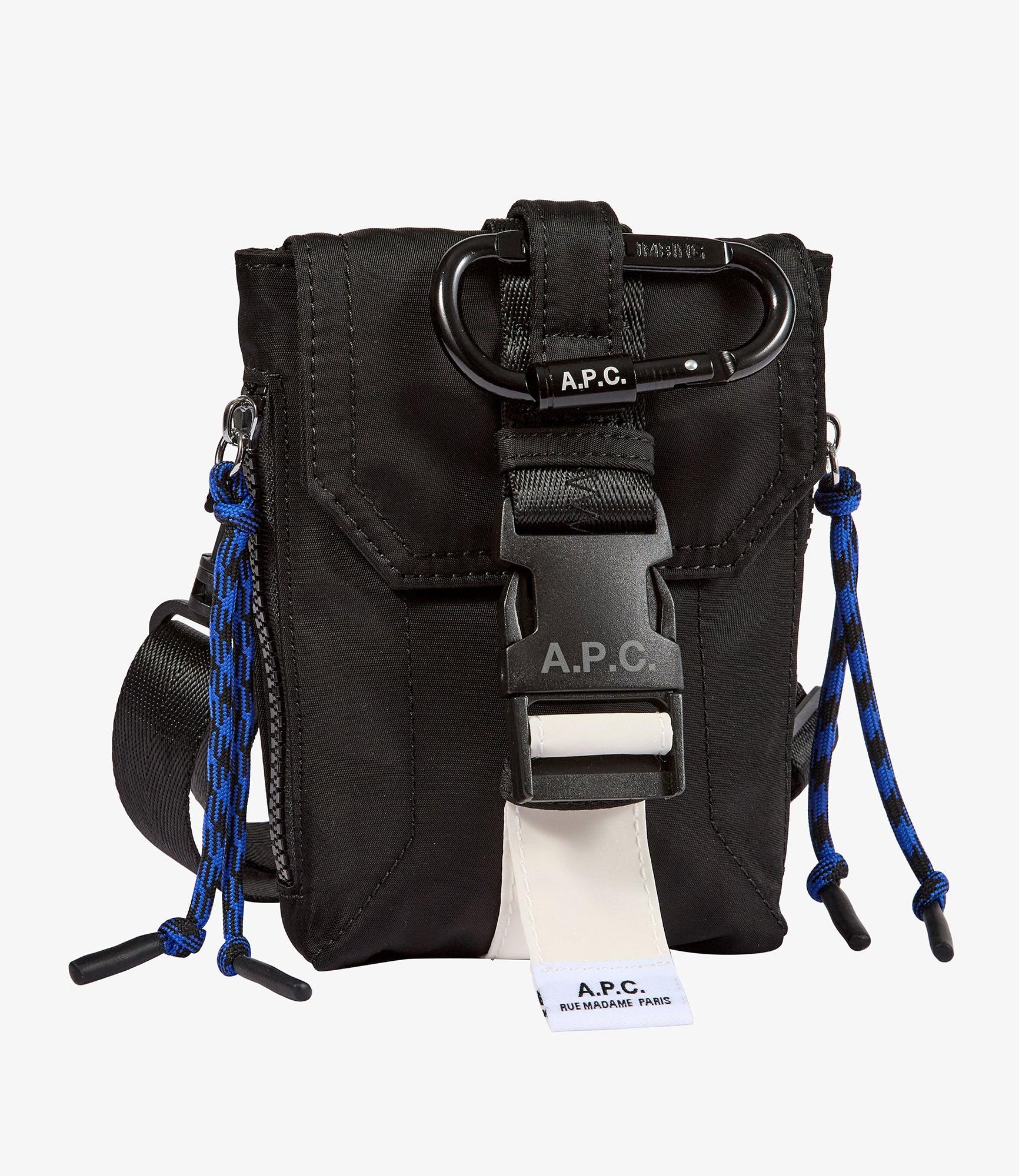 - Durable material. - Flap closure with a plastic A.P.C. logo buckle. - Adjustable shoulder strap. - "Climbing rope" details. - Black carabiner engraved with a white A.P.C. logo. - In the Trek product line.