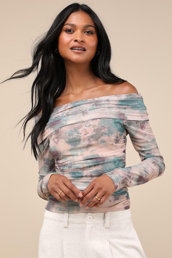 Slip on the Lulus Trendy Finesse Taupe Abstract Mesh Ruched Off-the-Shoulder Top for countless compliments! A multicolored abstract design (in hues of taupe, teal, and purple) adorns stretchy mesh knit as it shapes this trendy top with an off-the-shoulder bodice and a fold-over neckline, both adorned with flattering ruching at the sides. Sheer long sleeves complete the look.