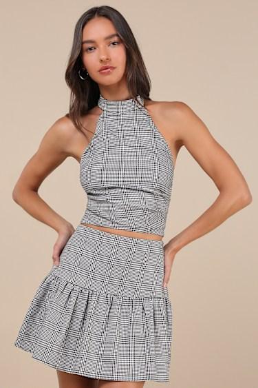 Everyone will adore your outfit when it includes the Lulus Trendy Momentum Black and White Plaid Backless Halter Top! Lightweight woven fabric boasts a plaid, houndstooth-style design throughout, shaping a mock-inspired halter neckline with loop-button closures at back. Fitted bodice continues down to a cropped hem. Smocked panel at back for fit. Pair with the matching skirt for a complete look!