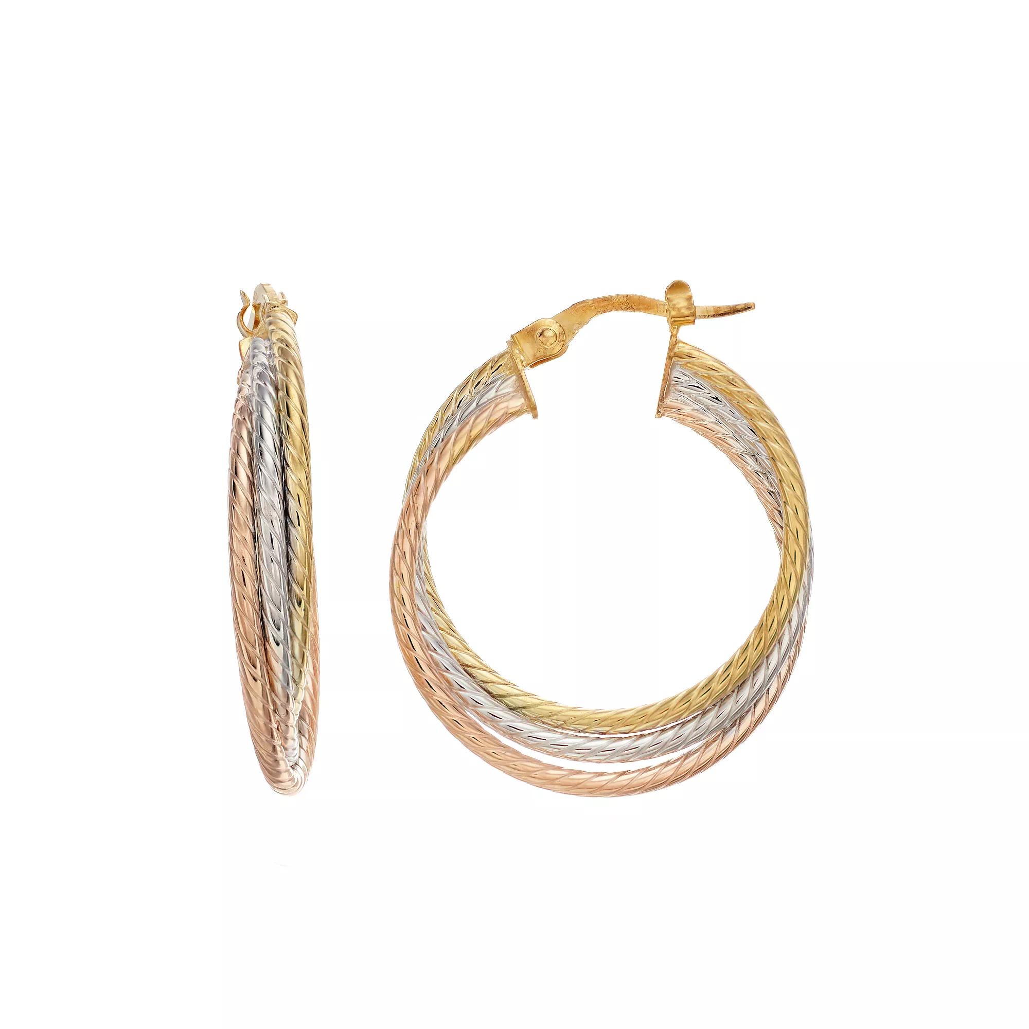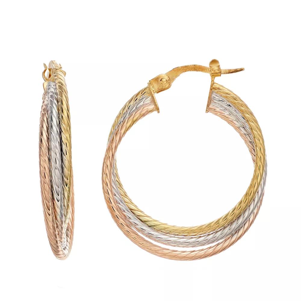 Featuring a trio of textured hoops in a mix of lustrous finishes, these earrings showcase your flair for modern trend. Featuring a trio of textured hoops in a mix of lustrous finishes, these earrings showcase your flair for modern trend. EARRING DETAILS Diameter: 28.3 mm Backings: click-it Metal: 14k gold, 14k white gold, 14k rose gold Finish: textured Packaging: boxed Size: One Size. Color: Multicolor. Gender: female. Age Group: adult.