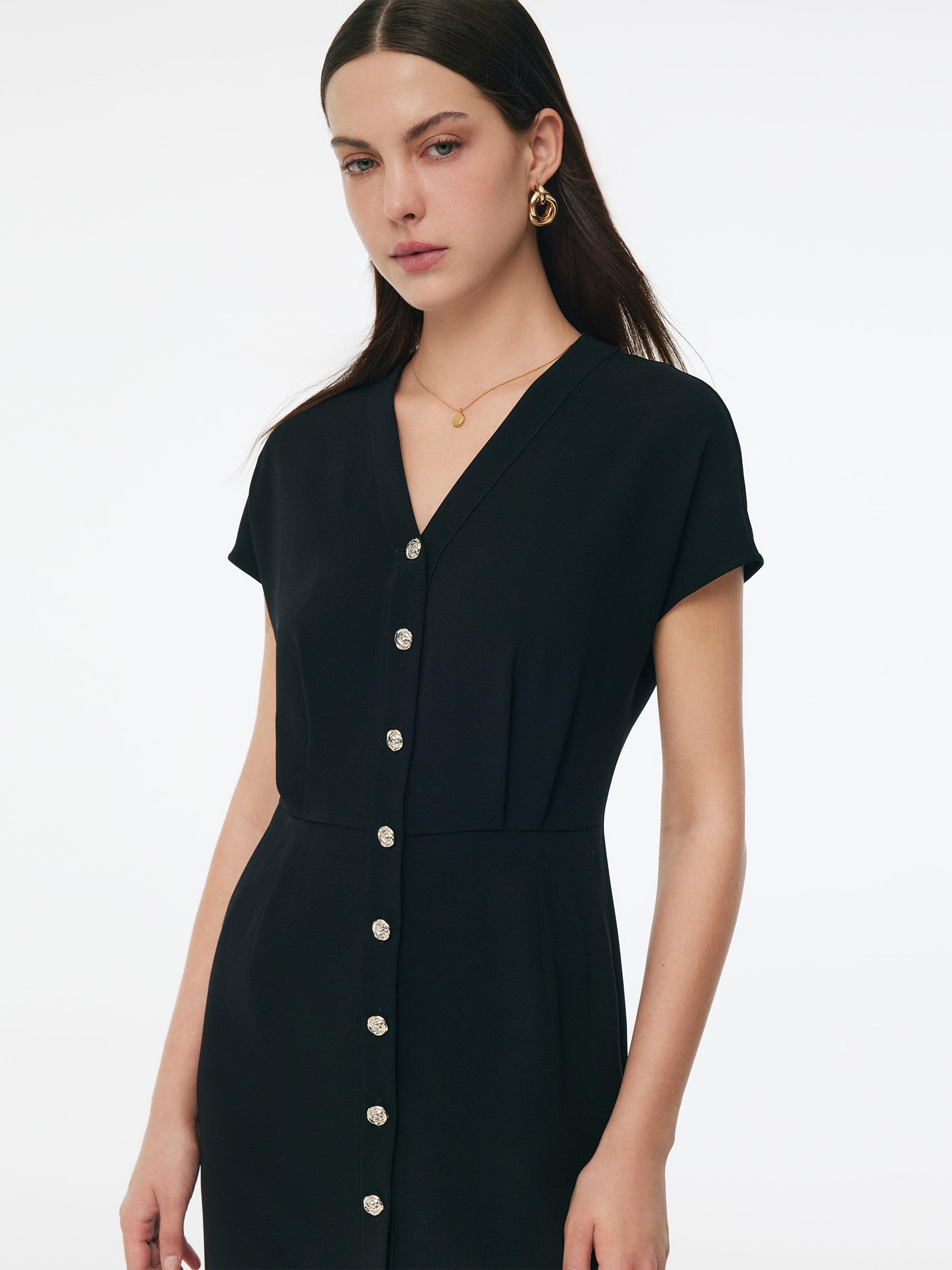 -Triacetate -X-line fit -Delicate rose-shaped buttons Tailored in an X-line silhouette which accentuates the waist, this dress is crafted from a luxurious triacetate blend with a silky texture. Featuring a classic V-neck, graceful sleeves design, a front slit at the hem, and pleated detailing at the front and back, it'