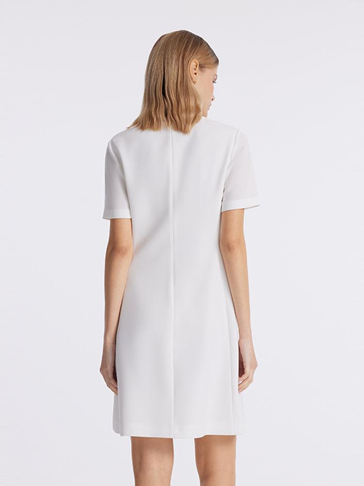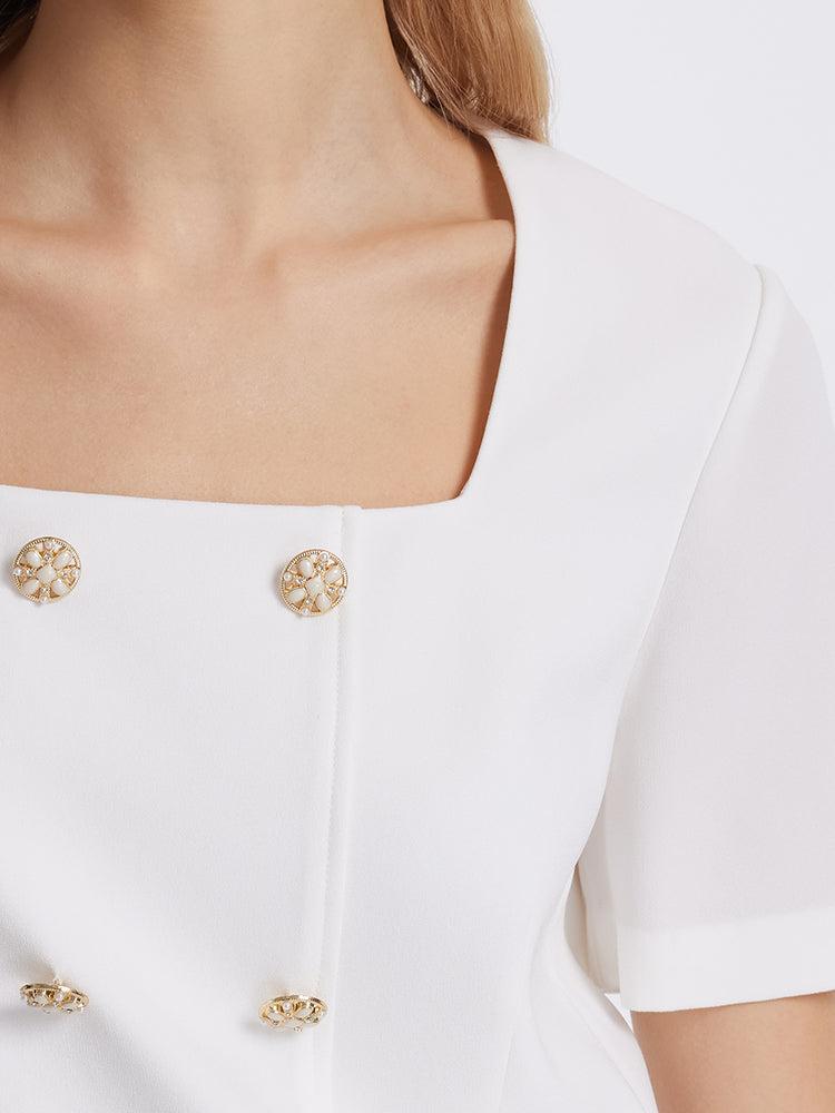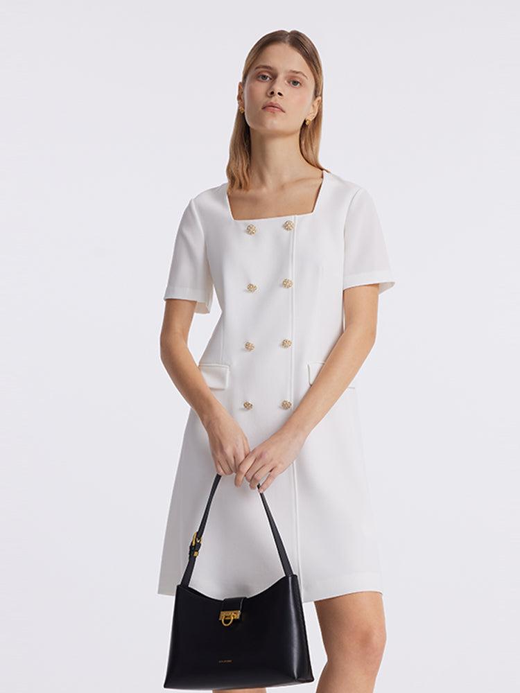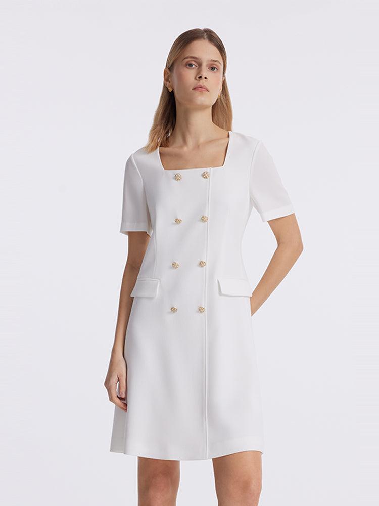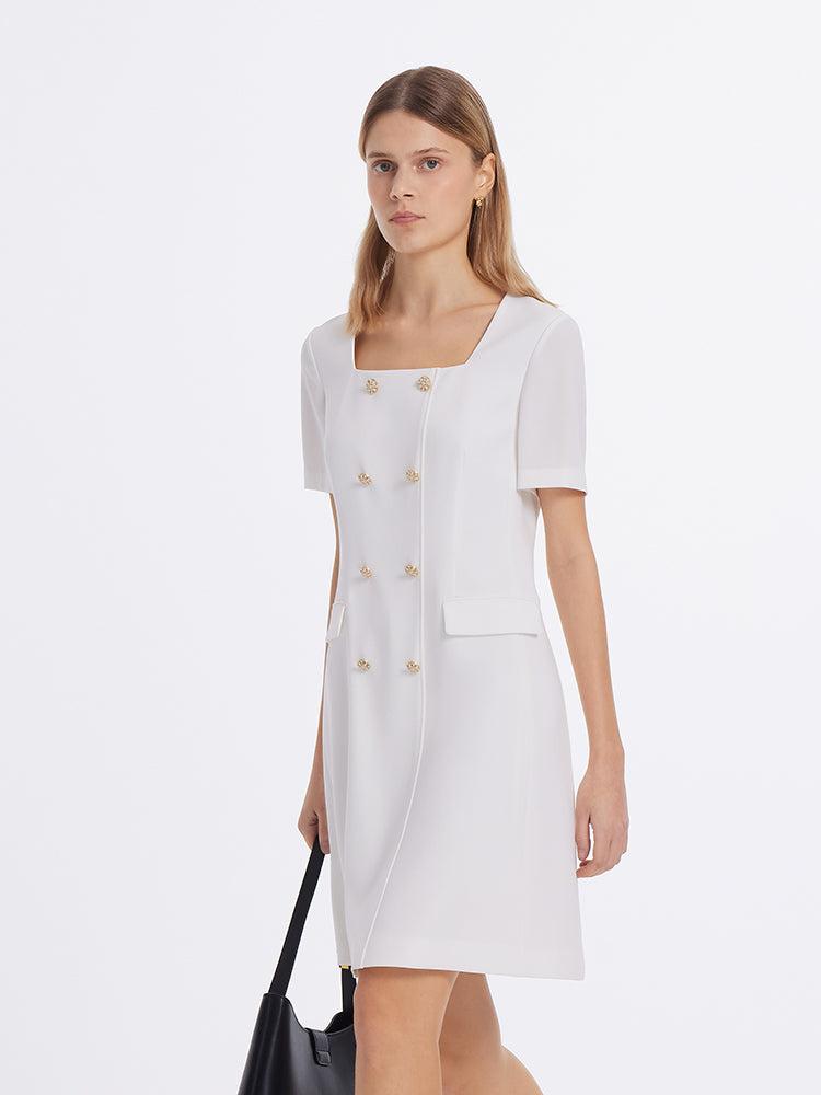 -Triacetate -A-line fit -Square neck This dress is made from triacetate fabric for comfort and breathability. The square neckline showcases timeless elegance, while the double-breasted button detail adds a touch of sophistication. The versatile style allows you to transition between the office and social occasions with