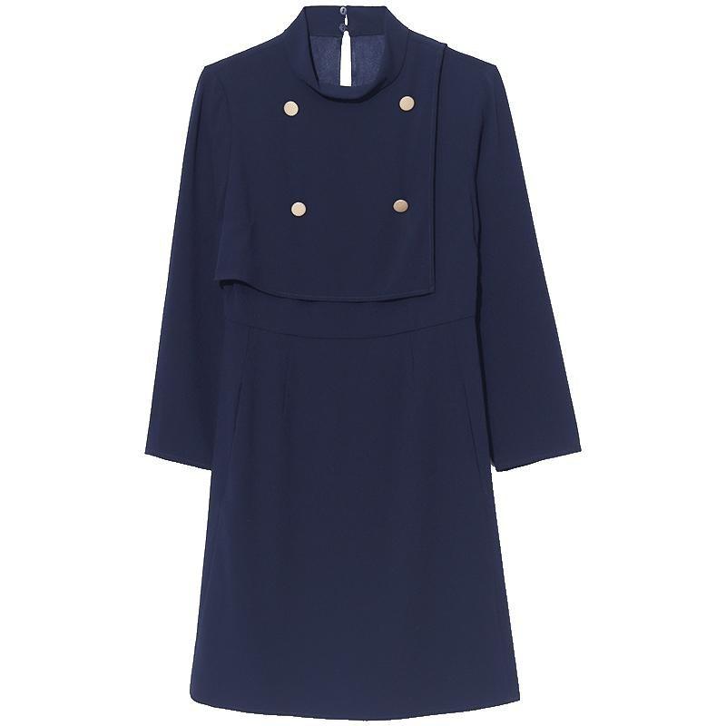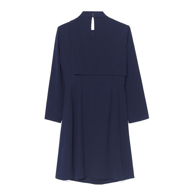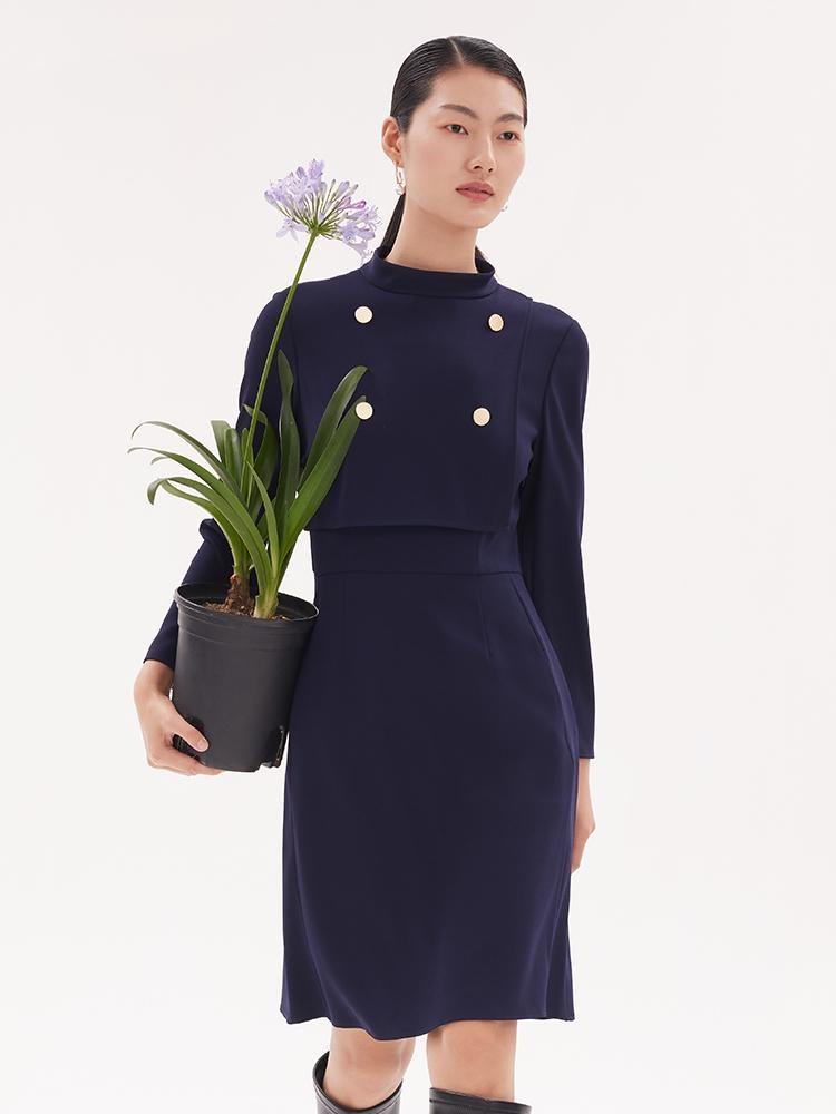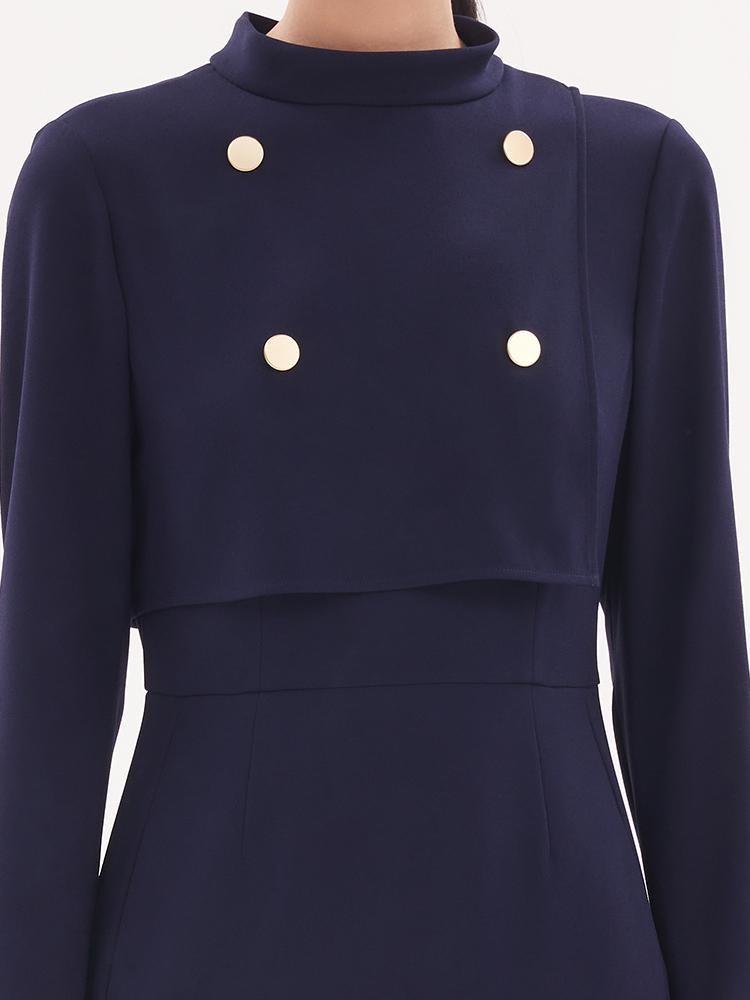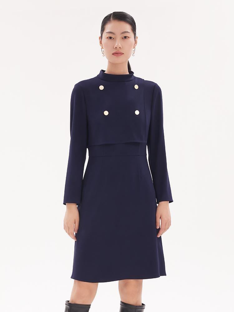 Triacetate Stand Collar Gathered Waist Midi Dress