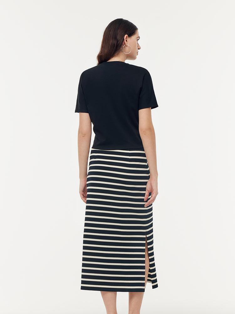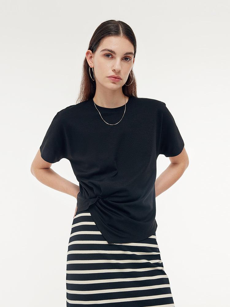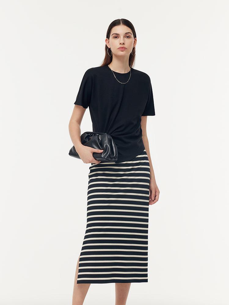 -Triacetate -Versatile -With elastic waistband A versatile and stylish two-piece set, this T-shirt and skirt combo is a wardrobe essential. Made from triacetate fabric, the T-shirt is soft and breathable, featuring a unique knotted design and asymmetrical hem. The skirt has an elastic waistband for added comfort. Wear