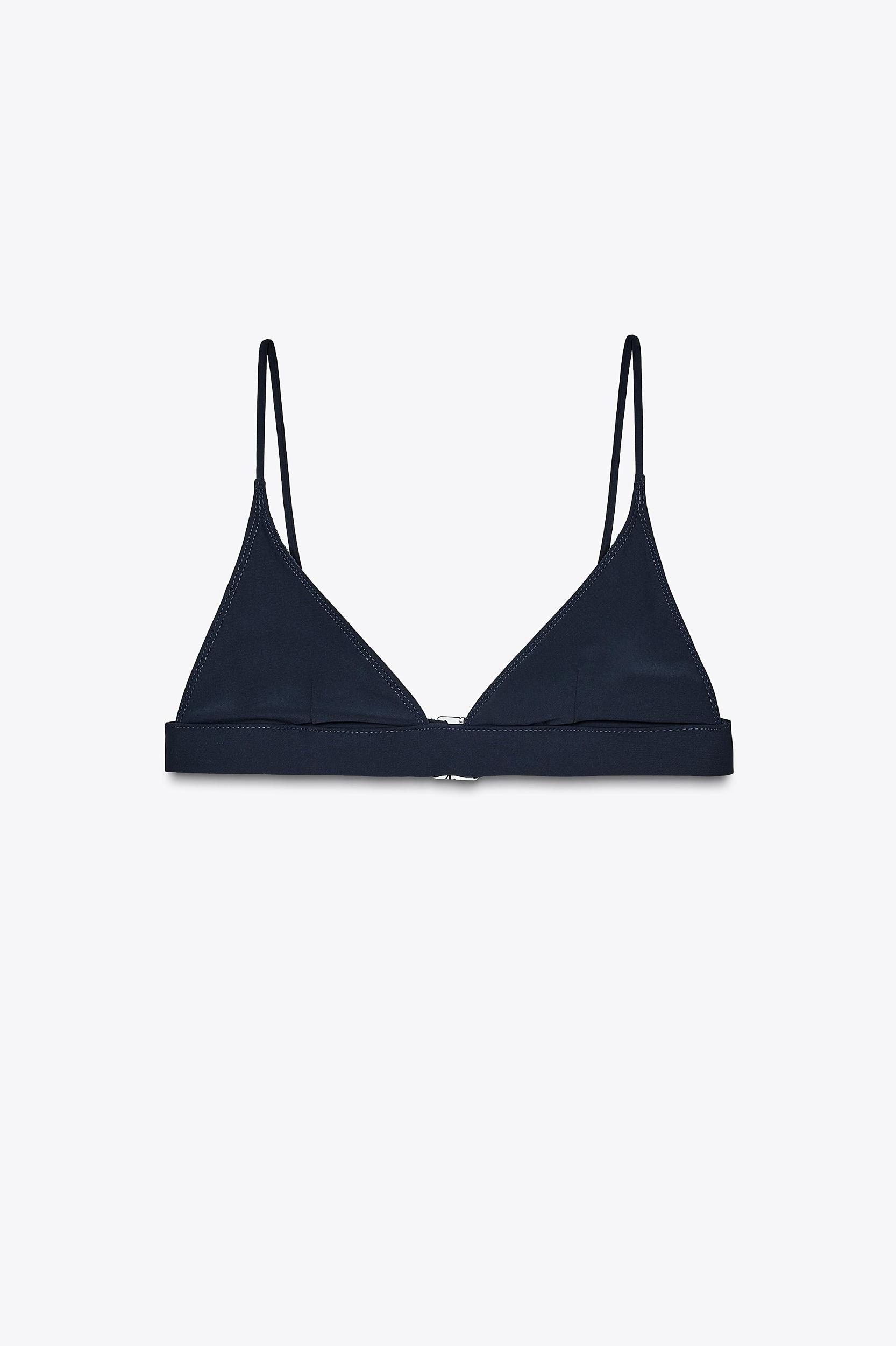 Triangle bikini top with adjustable thin straps. Wide chest strap detail for greater support. Inner lining. Back metal hook closure.
