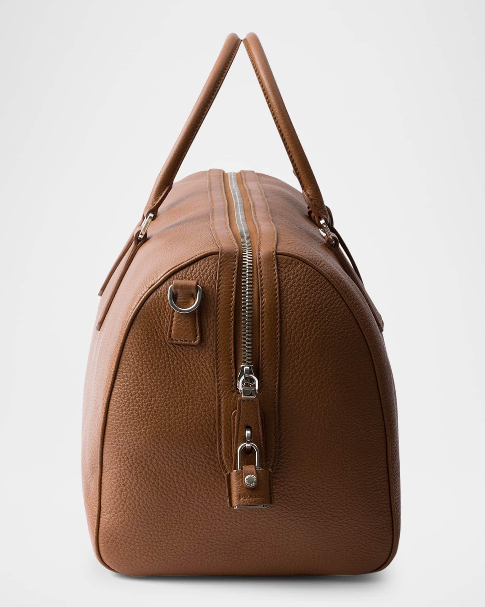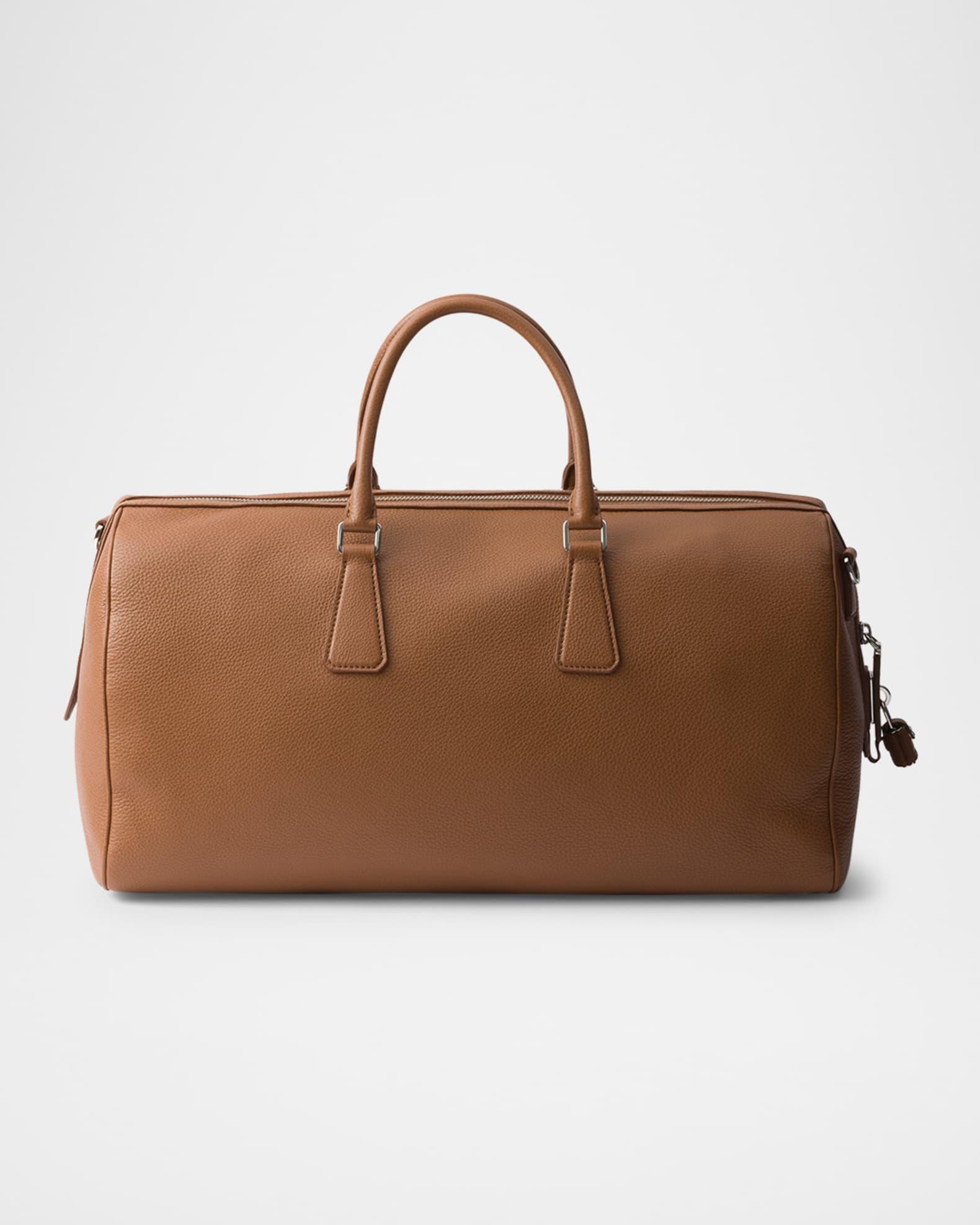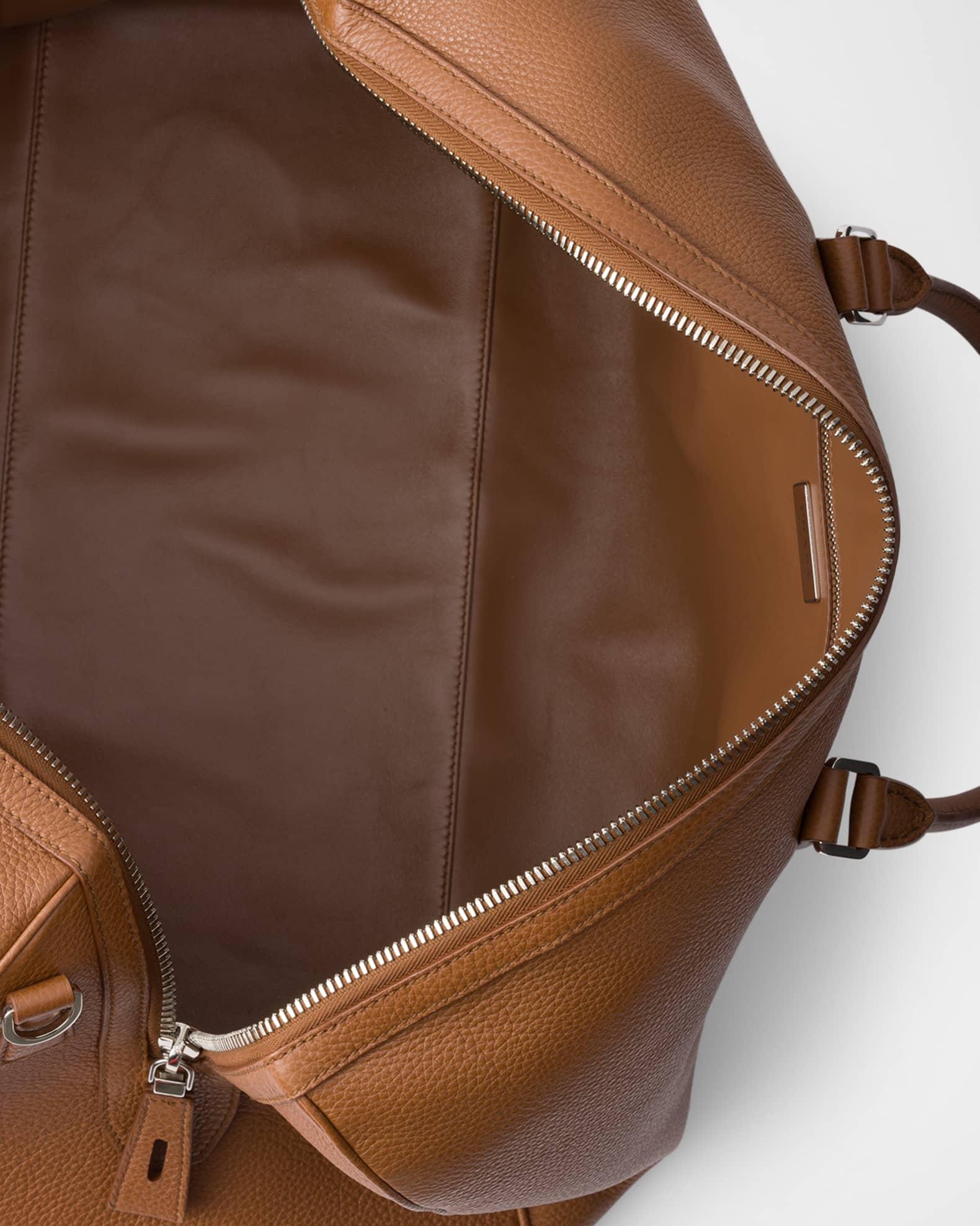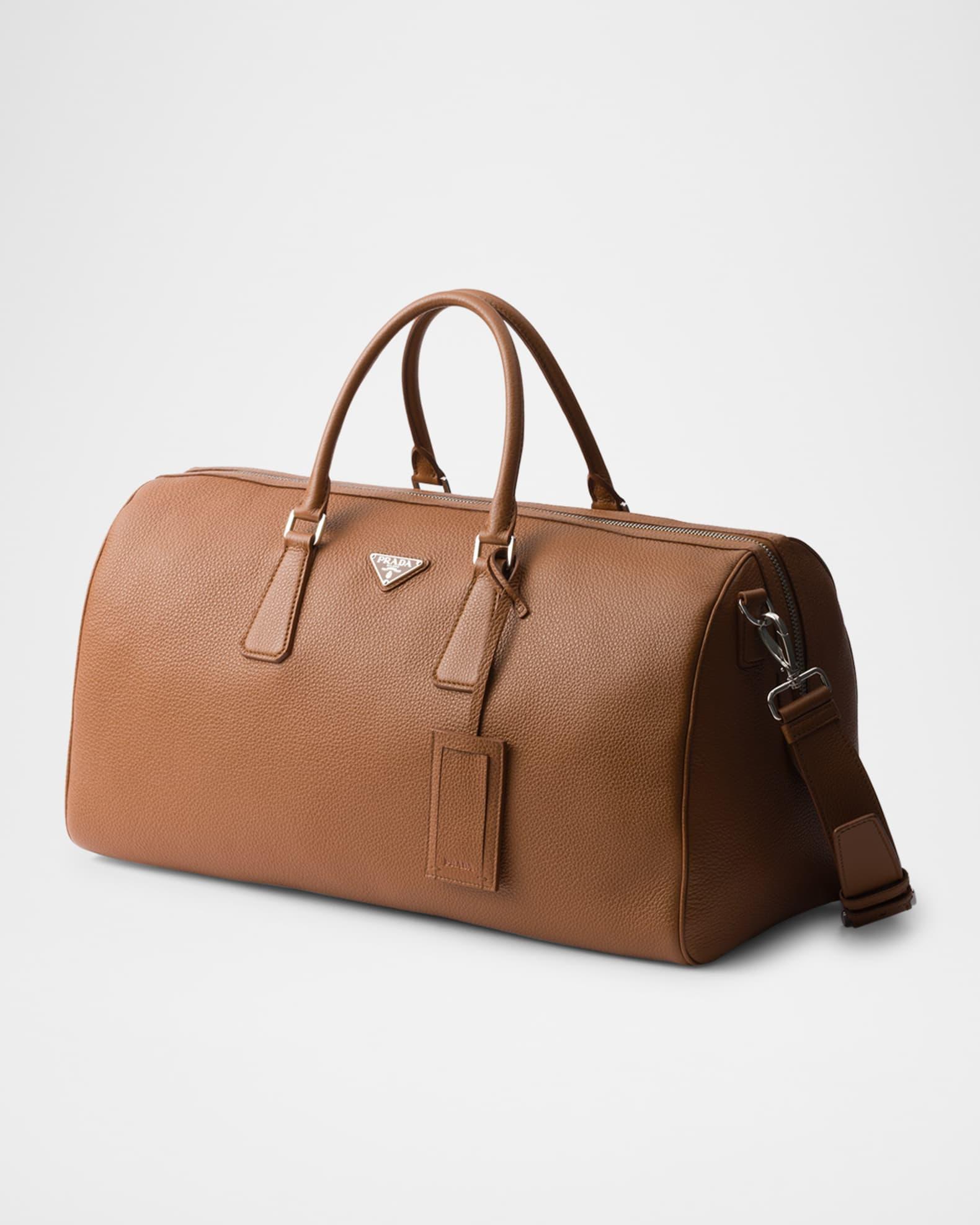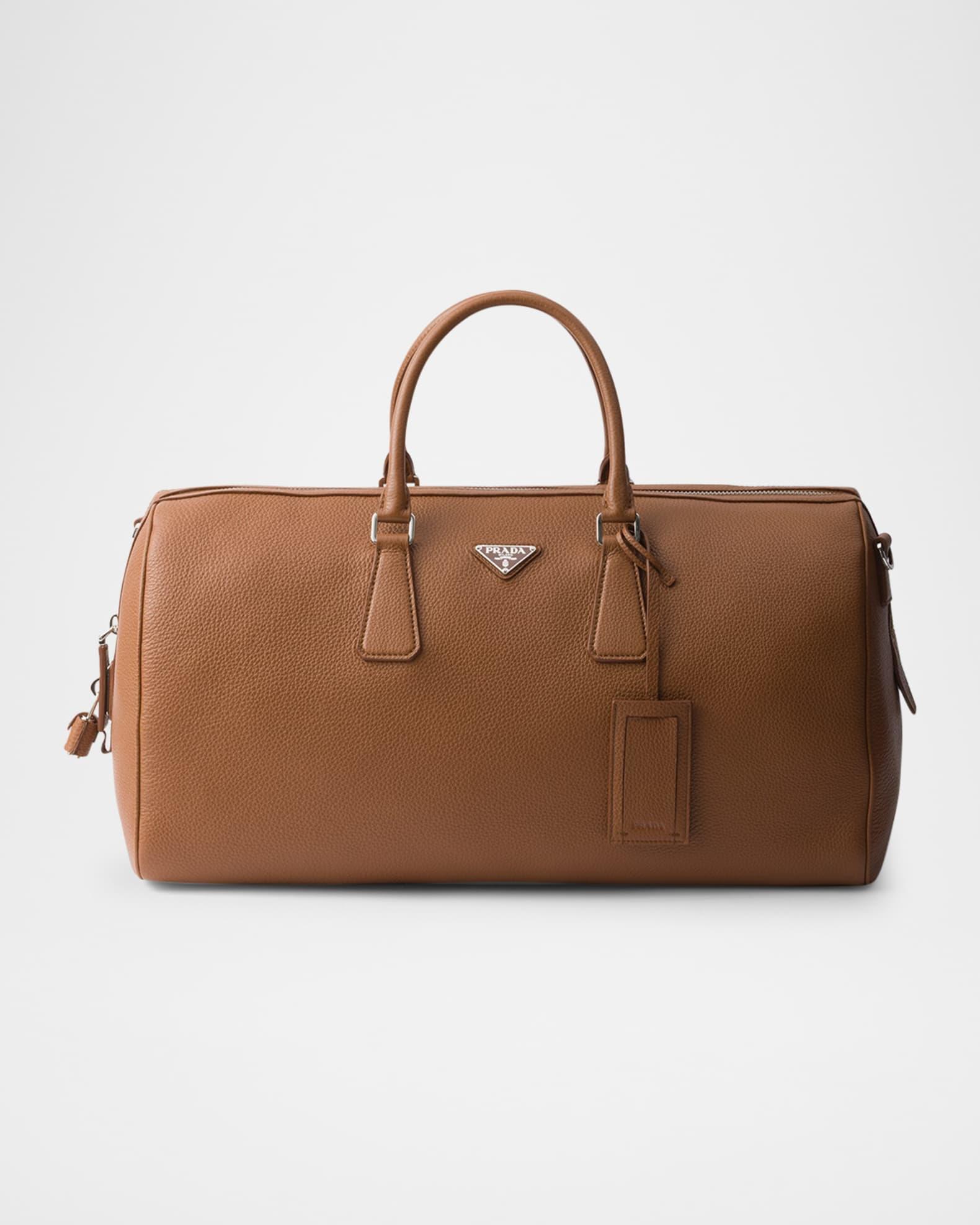 Prada soft, natural finish leather duffel bag embellished with refined, classic details and an enameled metal triangle logo completes the accessory with an iconic note Leather top handles Detachable, adjustable leather shoulder strap with buckle; a pprox. extension: 40.94"L- 45.67"L, drop: 19.7"L-21.7"L Enameled metal triangle logo on the front Top zip closure with lock Removable leather name tag Interior, two zip pockets Nappa leather and logo-print Re-Nylon lining Leather feet Imported