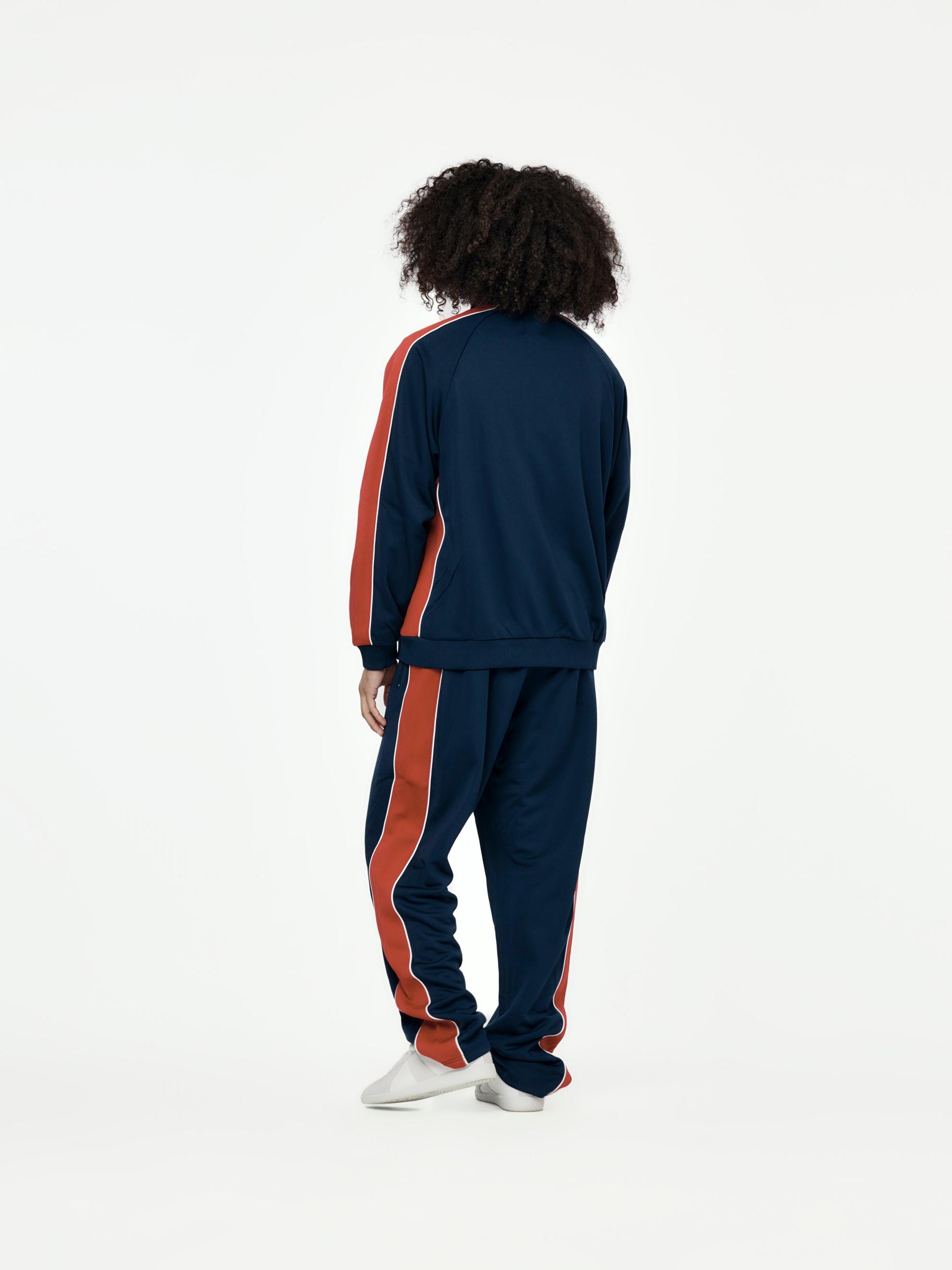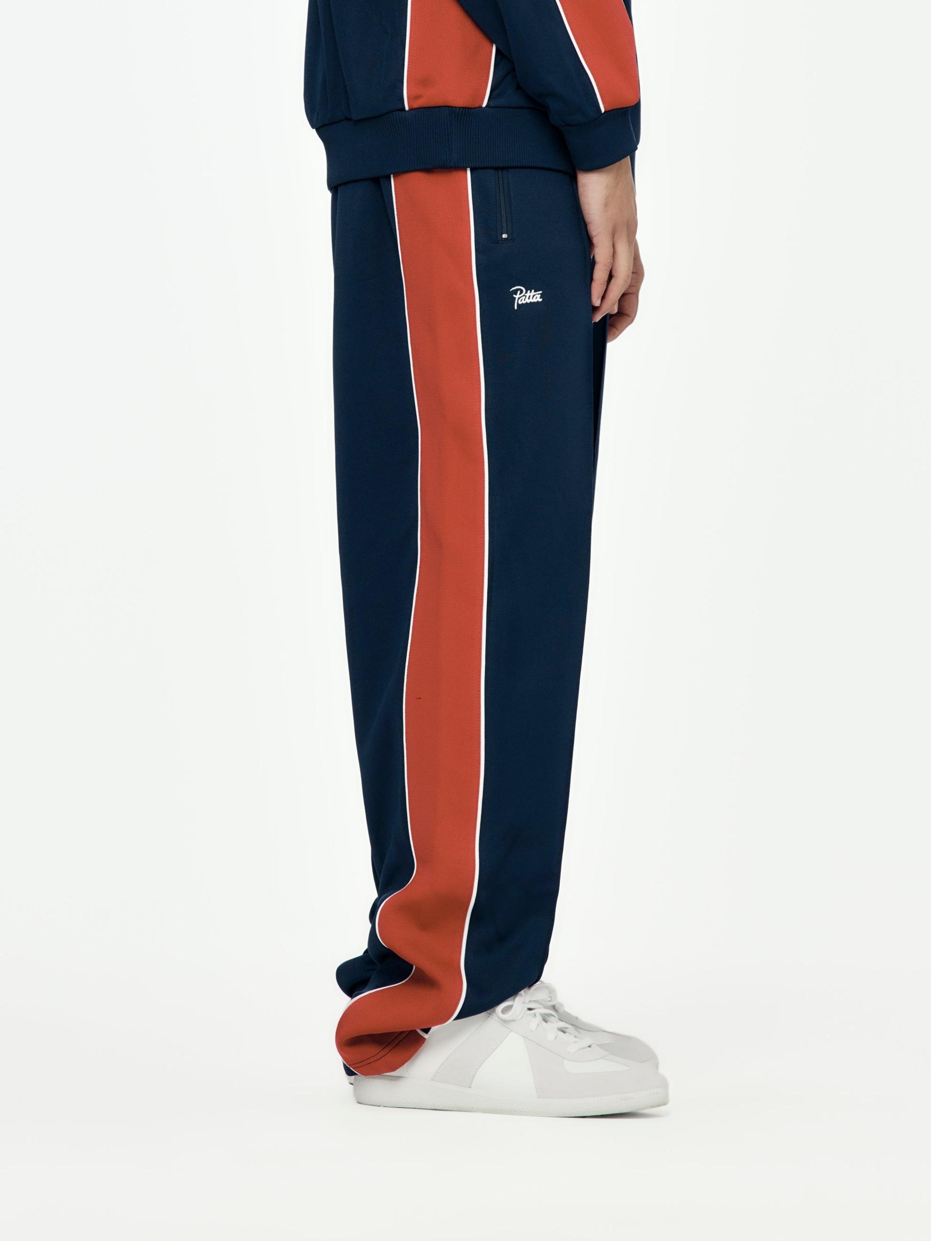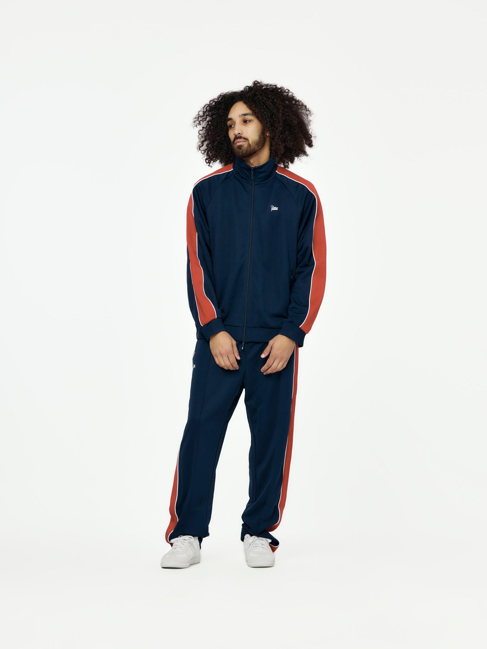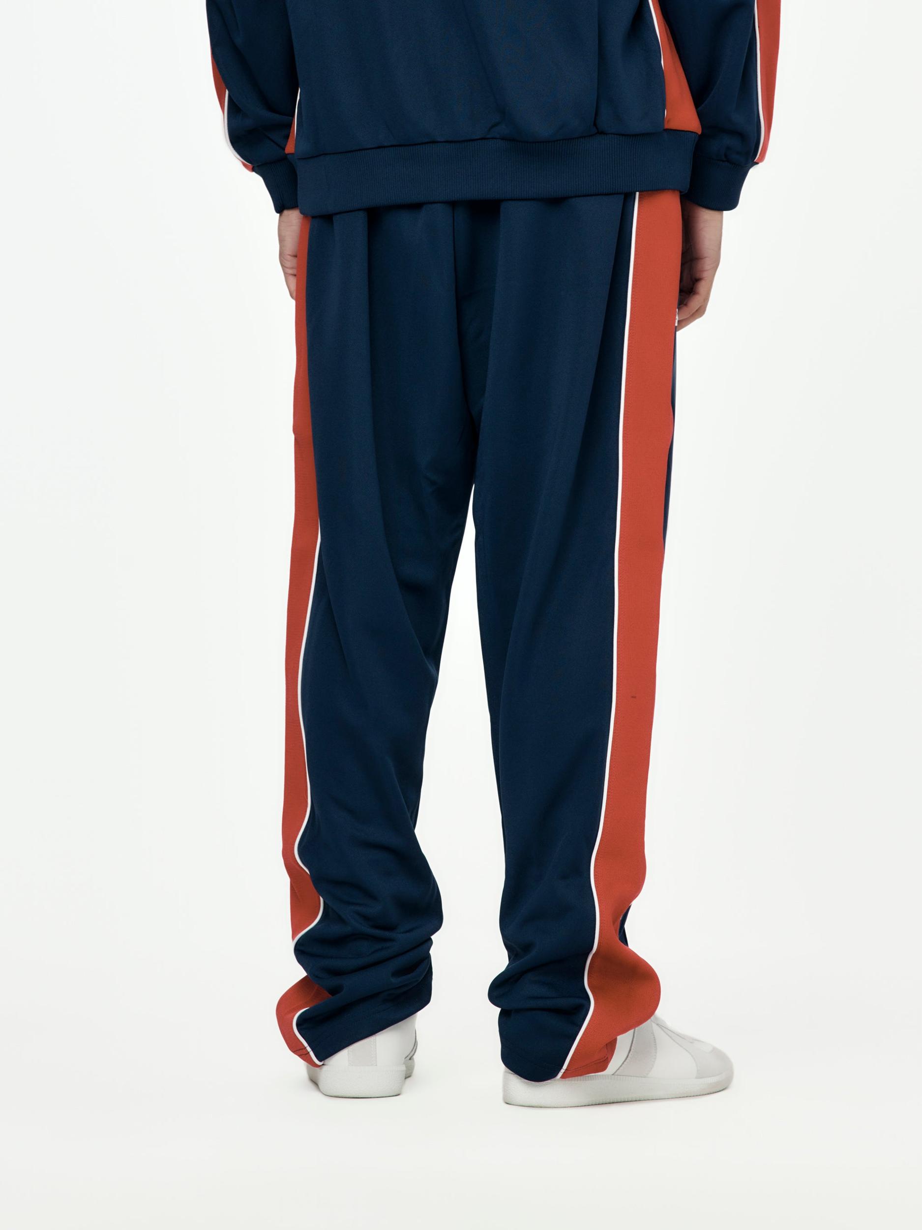 Elastic waist band track pants with embroidered logo. 100% polyester tricot, knitted pants.