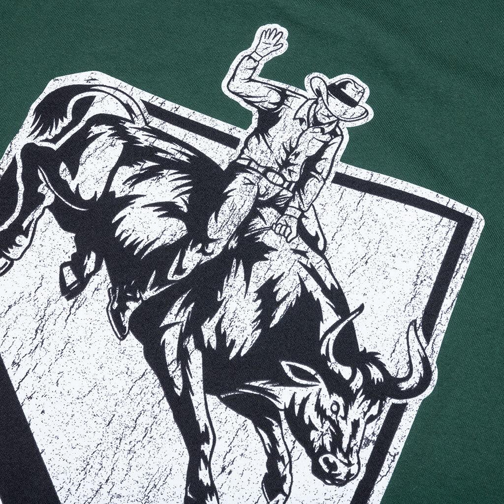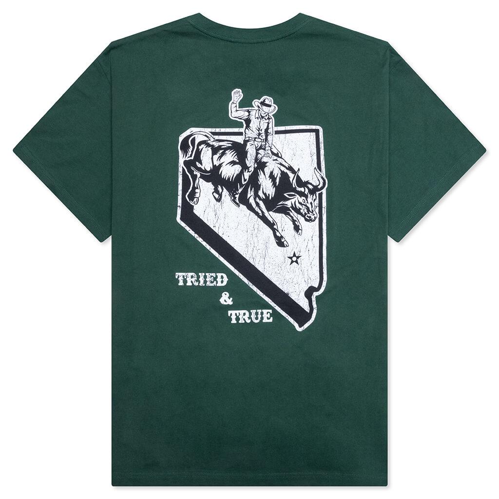 The Tried and True Tee in Dark Green is crafted from cotton for everyday comfort. Designed with a relaxed fit and a ribbed crewneck collar, it features cracked screen-printed graphics on the chest and back, adding a vintage-inspired touch to this versatile piece. 100% Cotton Relaxed fit Ribbed crewneck collar Cracked screen printed graphic, chest & back Style No: F122024X02-DRK