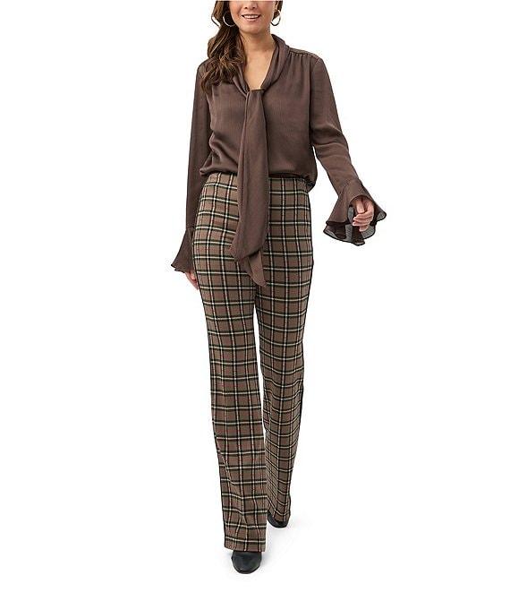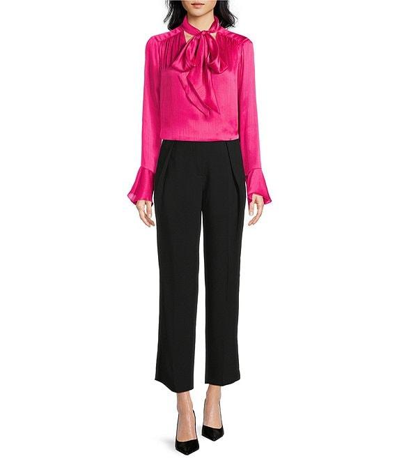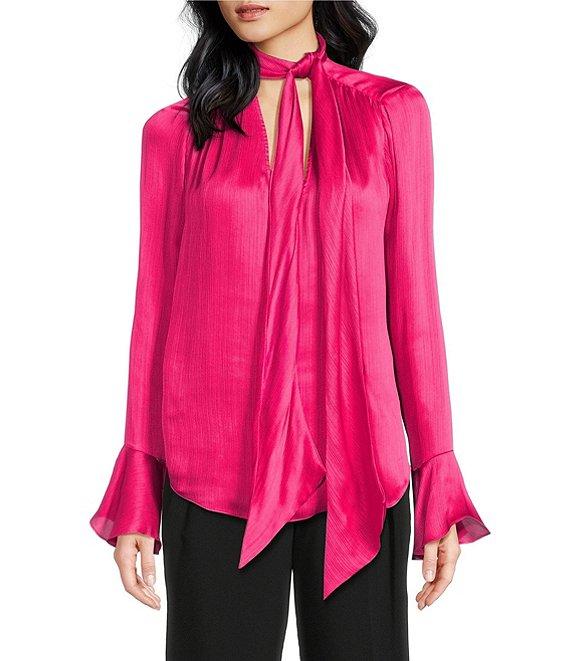 From Trina Turk, this blouse features: Georgette fabrication V-neckline Tie neck detail Long bell sleeves Straight hem Pullover construction Approx. 26" length Polyester Dry clean Imported.