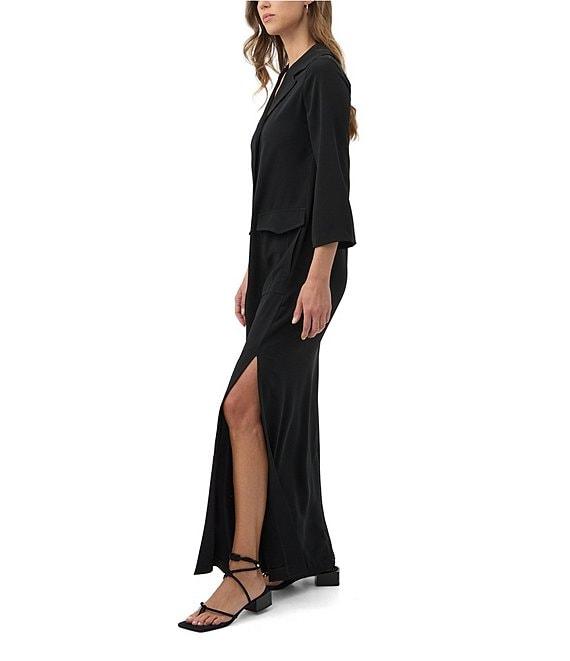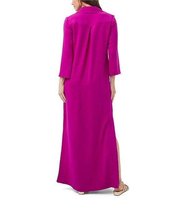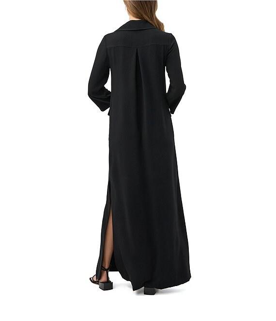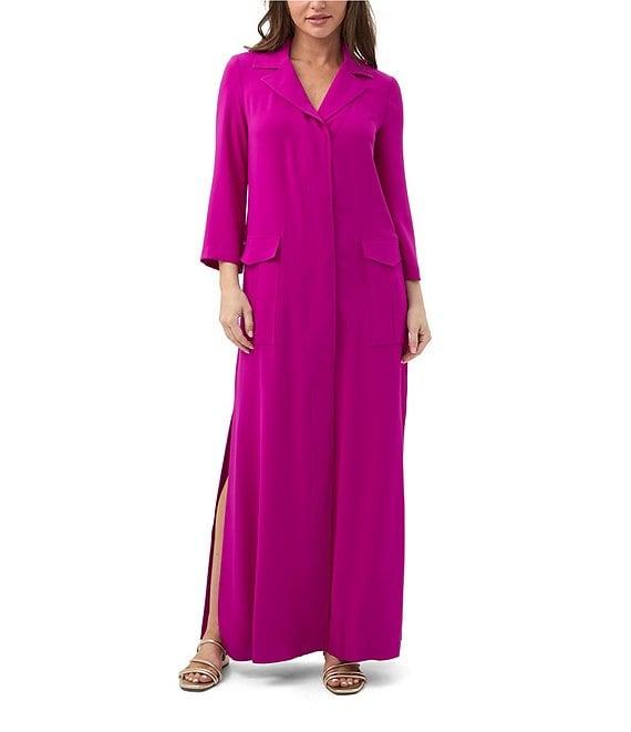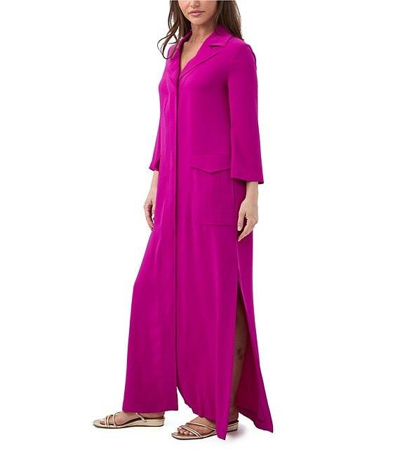 From Trian Turk, this dress features: Georgette fabrication Notch lapel neckline Long sleeves Faux front flap pockets Side pockets Straight hem with side slits Pullover construction Approx. 58" length Polyester Machine wash Made in the USA.