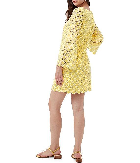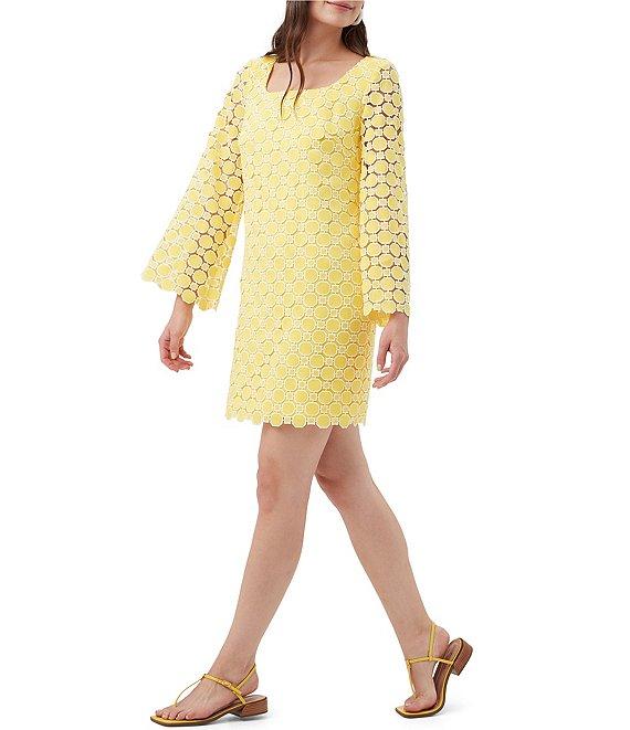 From Trina Turk, this dress features: Geometric lace fabrication Shift silhouette Square neckline Long bell sleeves Scallop hem Zip back closure Approx. 37" length Polyester Dry clean Imported.