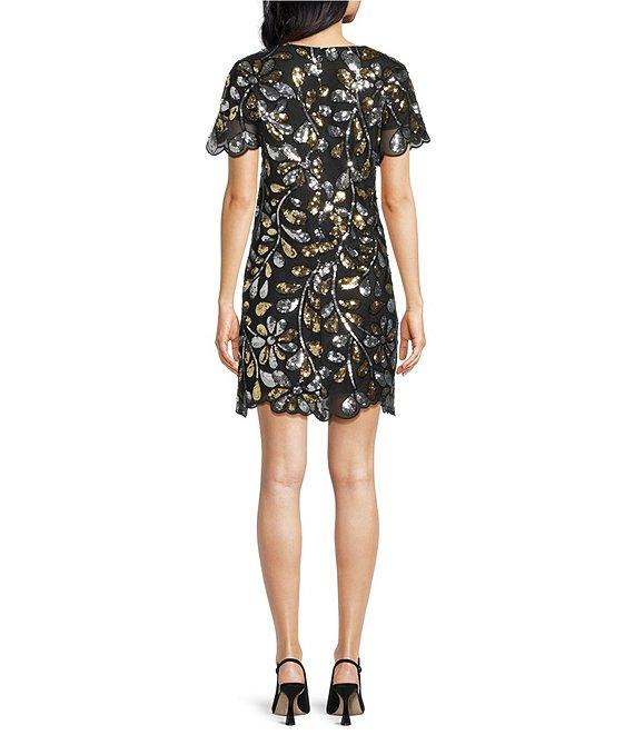 From Trina Turk, this dress features: Sequin paillette fabrication V-neckline Sheath silhouette Short sleeves Scallop trim Back zip closure Approx. 36" length Nylon Dry clean Imported.