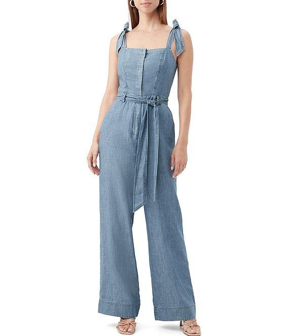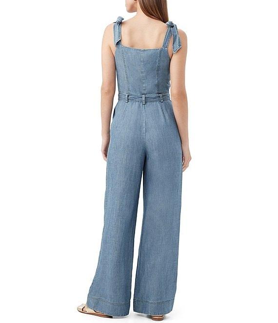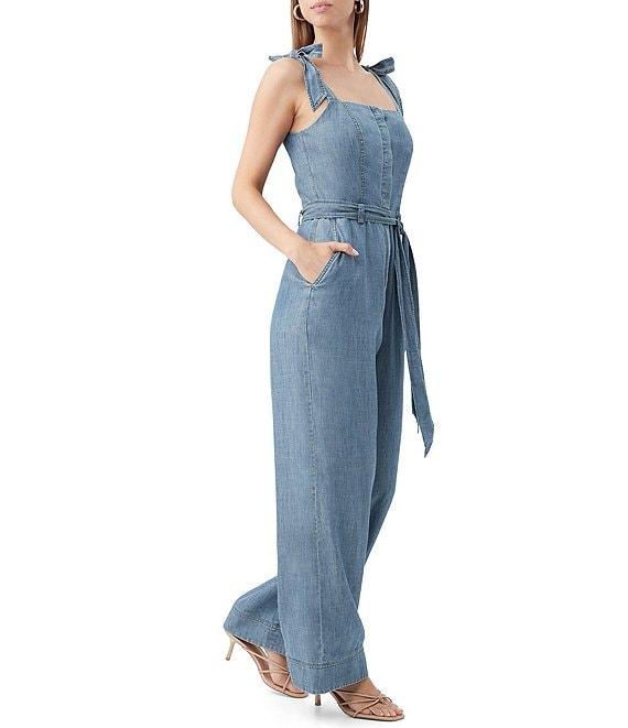 From Trina Turk, this jumpsuit features:Chambray fabrication Wide-leg silhouette Square neckline Sleeveless with adjustable straps Side front pockets Self tie belt at waistFull-length inseamRuns true to sizeStraight hemlineButton front closureApprox. 31" inseam Lyocell/linen Machine wash/dry flat Imported.