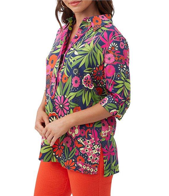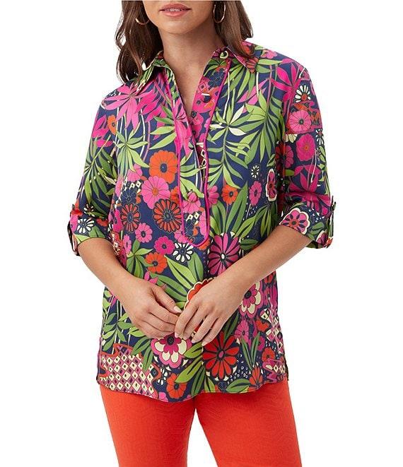 From Trina Turk, this top features: Woven fabrication Floral print Half button point collar neckline Elbow sleeves with button cuffs Straight hem with side slits Pullover construction Approx. 27" length Modal/rayon Dry clean Imported.