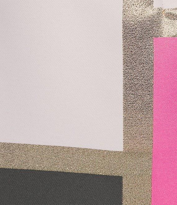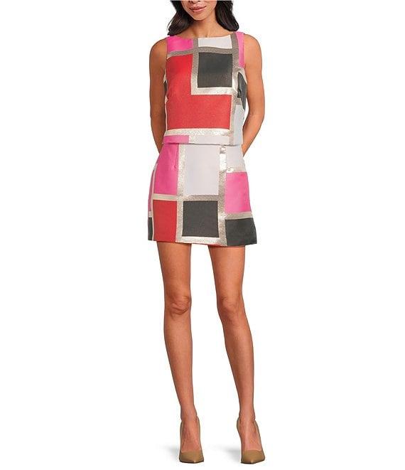 From Trina Turk, this skirt features: Colorblock jacquard fabrication A-line silhouette High-waisted Straight hem Side zip closure Approx. 17" length Polyester/metal polyester Dry clean Imported.
