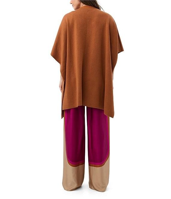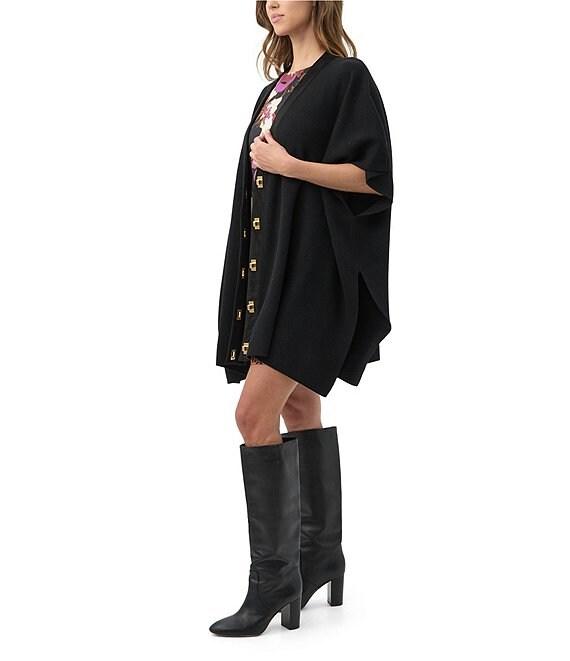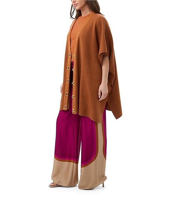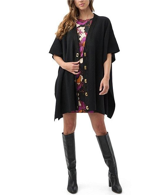 From Trina Turk, this poncho features: Knit fabrication V-neckline Elbow sleeves Sharkbite hem Turn lock front closure Approx. 34" length Polyester/acrylic/nylon/wool Dry clean Imported.