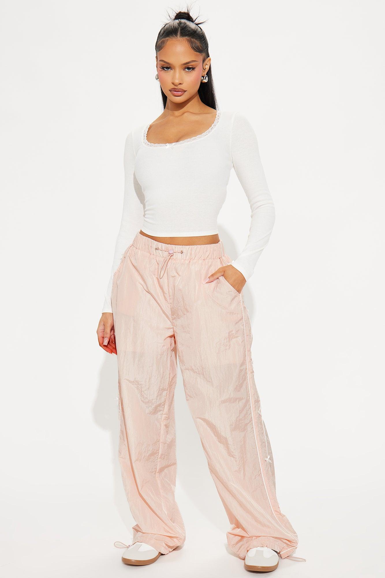 Available In Blush And Charcoal. Windbreaker Track Pant Jogger Mid Rise Elastic Waistband Adjustable Toggler Side Stripe Bow Tie Detail Wide Leg Non Stretch 31" Inseam Shell 100% Polyamide Lining 100% Polyester Imported