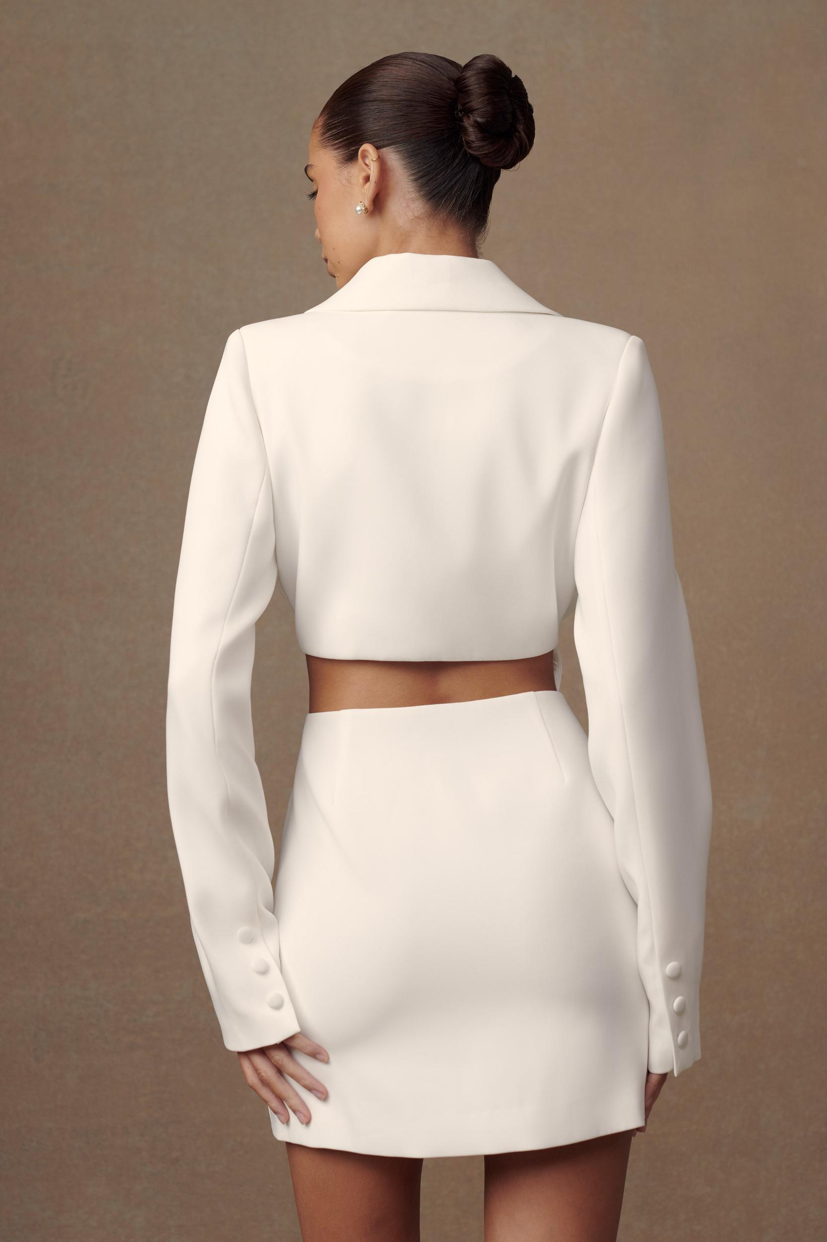 Bridal magic.Step into sophistication with the TRINITY Crepe Blazer Dress, a refined ensemble that effortlessly combines elegance with contemporary allure. Boasting a V neckline and adorned with round collar detail, this dress exudes timeless charm with a modern twist. The double-breasted design adds a touch of refinement, complemented by functional buttons for versatility and style. With long sleeves for added sophistication and a back cutout detail for a hint of allure, the Trinity dress is the perfect choice for making a statement at any event. Complete with a mini length and non-functional button detail at the sleeve hem, it's the epitome of chic style for the modern woman.