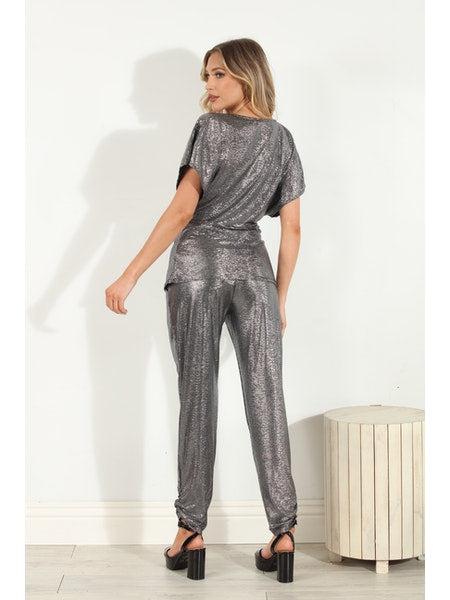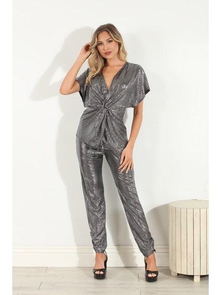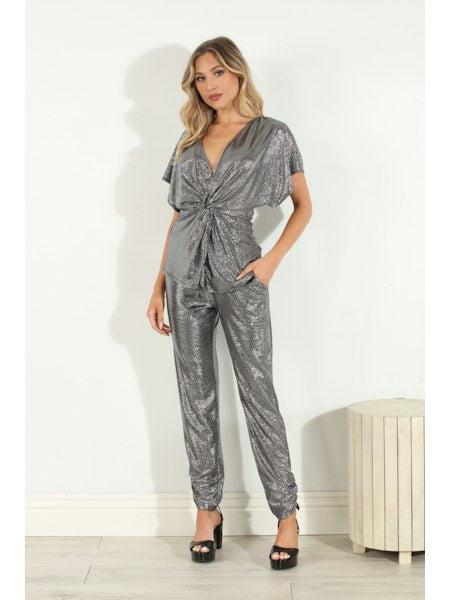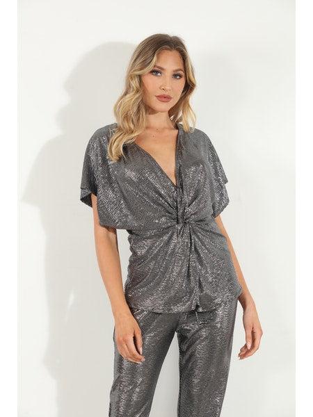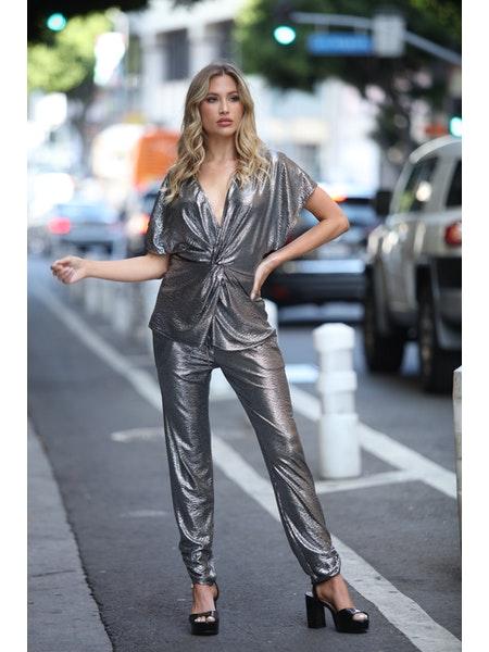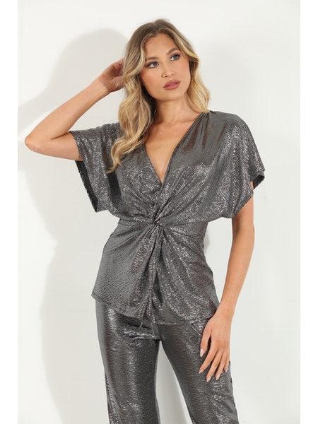 This Trinity Holiday Top is the sparkly perfect addition to your night out look. Featuring a V neck line, a playful front twist design, and lightweight stretch fabric, this top is as stylish as it is comfy. The silver foil finish adds that extra holiday glimmer! Shine bright like a diamond in this must-have top.