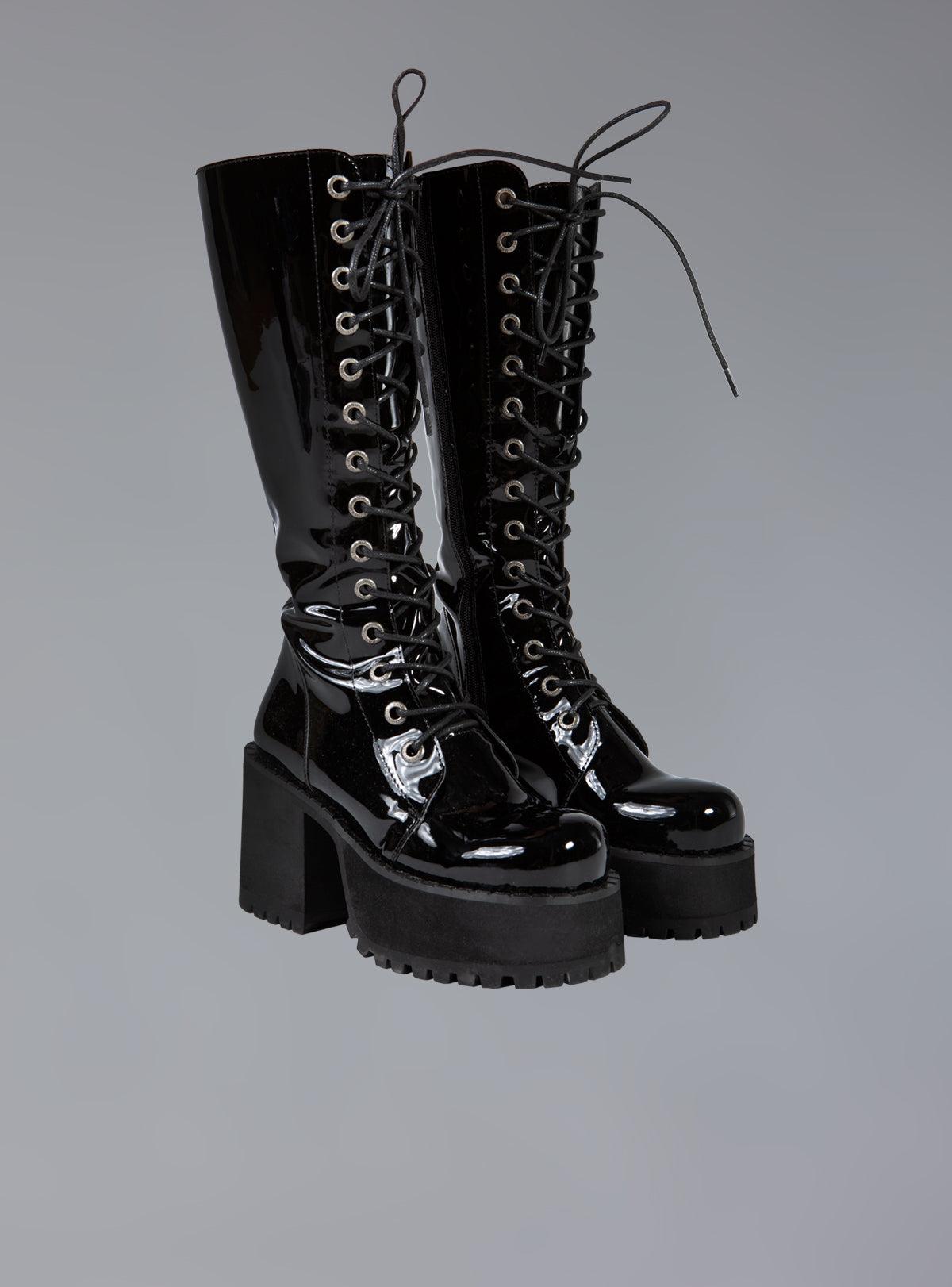 *This item is excluded from all promotions/discounts. Patent leather boot with branded metal eyelets and cord shoelaces. Inside zipper makes for easy access and a stacked platform and heel measuring 1." in the front and a 3.5" heel. Fit is true to size. *Due to the sensitive nature of patent leather some slight creasing may show at flex points, this is common and expected. Click Here for a printable size chart (make sure you print at Actual Size to ensure accuracy) For any questions about sizing please reach out to our team ~