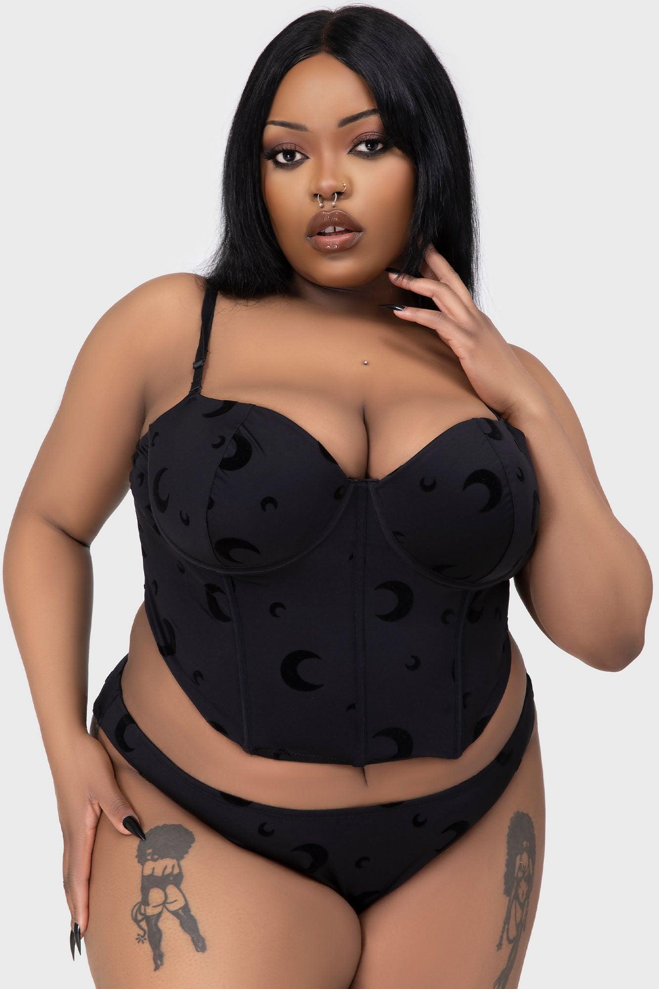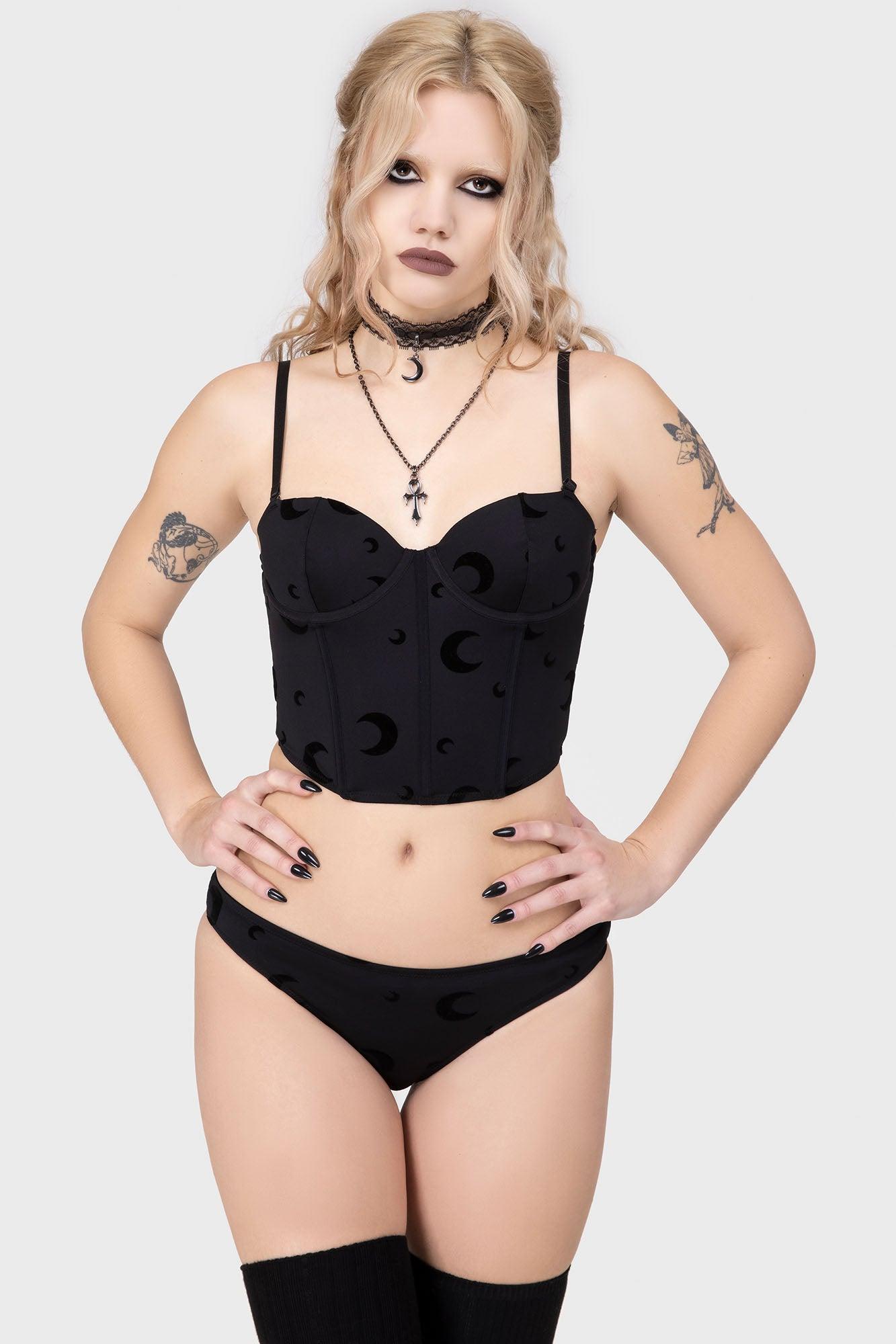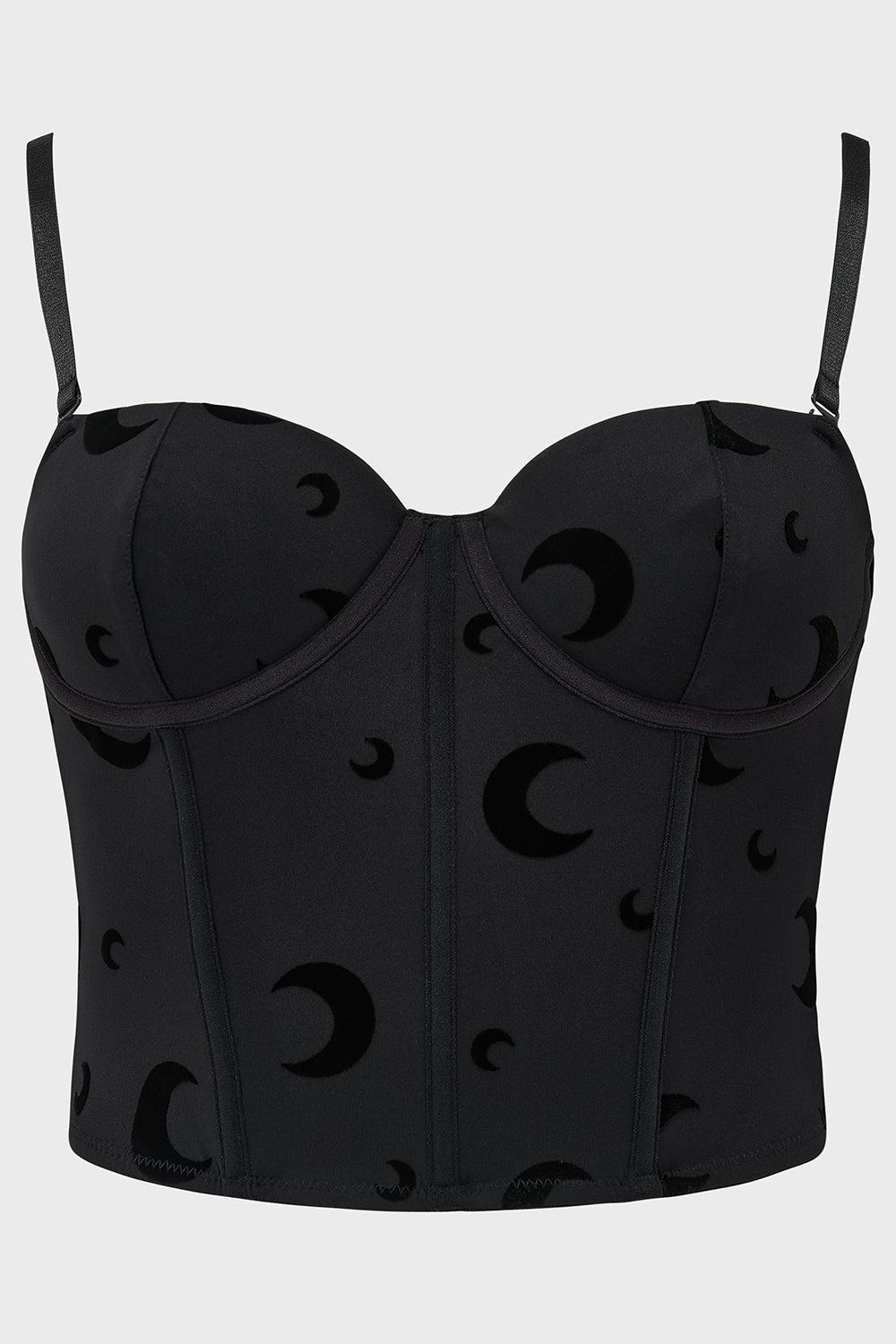 TRIP TO THE MOON BRA - Soft stretch fabric.- Corset boning details.- Crescent moon velvet flocking design.- Hook and eye back fastening.Model is 5’8 and wears a size XS.With KILLSTAR branding, Fabric : 66% polyamide 34% Elastane Lining : 100% Polyester. Hand wash delicate (30°c) / Do not bleach / Do not tumble dry / Do not iron / Do not dry clean. Imported.