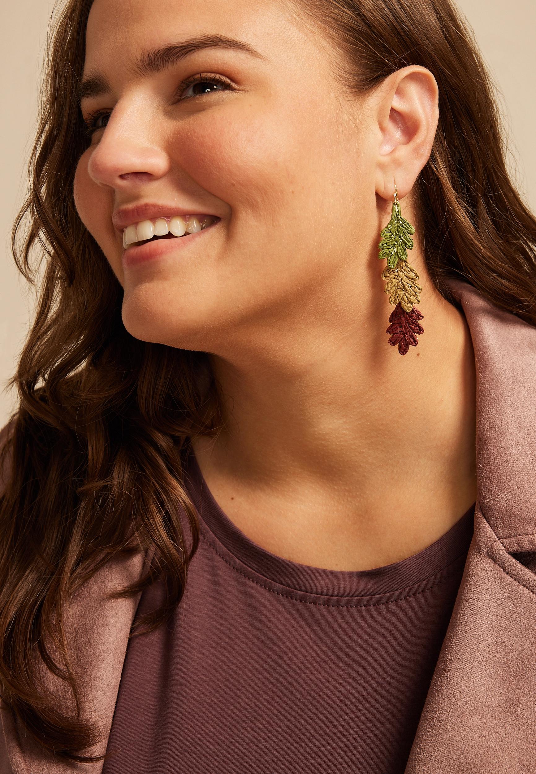 Celebrate the beauty of fall with our Triple Fall Leaf Raffia Drop Earrings, a stunning tribute to seasonal color and natural elegance. Featuring three raffia wrapped leaf-shaped elements in rich hues of green, mustard yellow, and deep red, these earrings cascade gracefully to evoke the charm of autumn foliage. Crafted from lightweight materials for all-day comfort and suspended from sleek gold hooks, they offer a perfect balance of artisanal detail and effortless style. Whether you're dressing up for a cozy gathering or adding flair to your everyday look, these earrings bring warmth and vibrancy to any outfit. .mar-pdp-section .mar-product-description {color: #000;}.mar-pdp-section .mar-product-description ul, .mar-pdp-section .mar-product-description ul>li {margin-left: 10px;padding-left: 10px;}.mar-pdp-section .mar-product-description .mar-product-description-content ul li{list-style-type: disc;margin: 0 0 5px;padding-left: 5px;}.mar-pdp-section .mar-product-description p {color: #000;padding: 5px 0;}@media only screen and (max-width: 1023px){.mar-pdp-section .mar-product-description .mar-product-description-content ul li{list-style-type: disc !important;} .mar-pdp-section .mar-product-description .mar-product-description-content .mar-tab-content ul{padding-left: 10px;}.mar-pdp-section .mar-product-description .mar-product-description-content .mar-tab-content {font-weight: 300;}} Features: goldtone metal green, yellow, and red, raffia wrapped detail triple leaf shaped drop silhouette fish hook backs nickel free