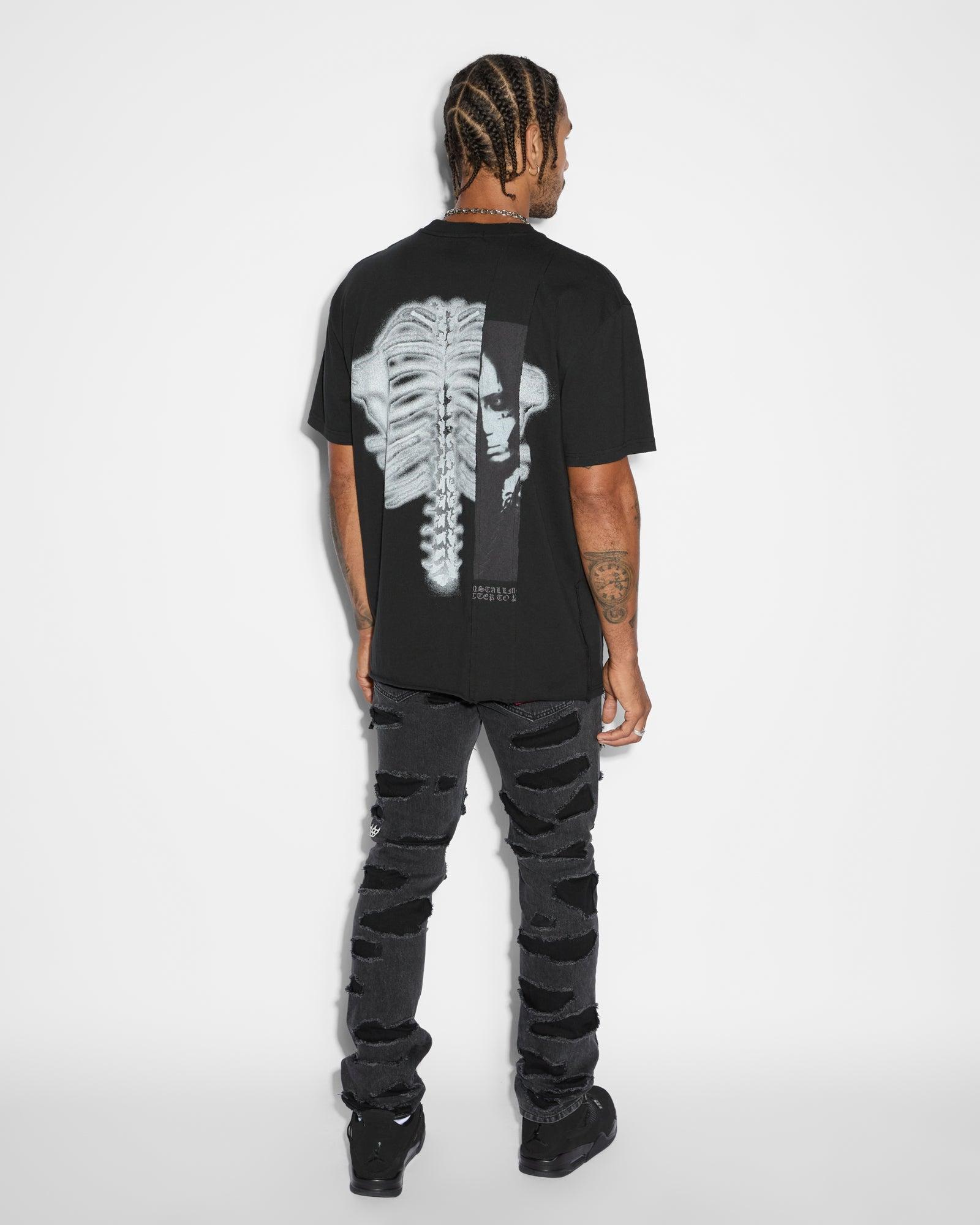 The Trippie Redd Biggie Ss Tee Blackout is an oversized fit t-shirt made from a jet black heavyweight cotton jersey treated with an aged wash. The tee is detailed with a mix of digital water based screen printing with embroidery and spliced raw edge panels across the front and back. Finished with a raw cut back hem and reverse overlocked side seam with Ksubi x Trippie Redd branding.