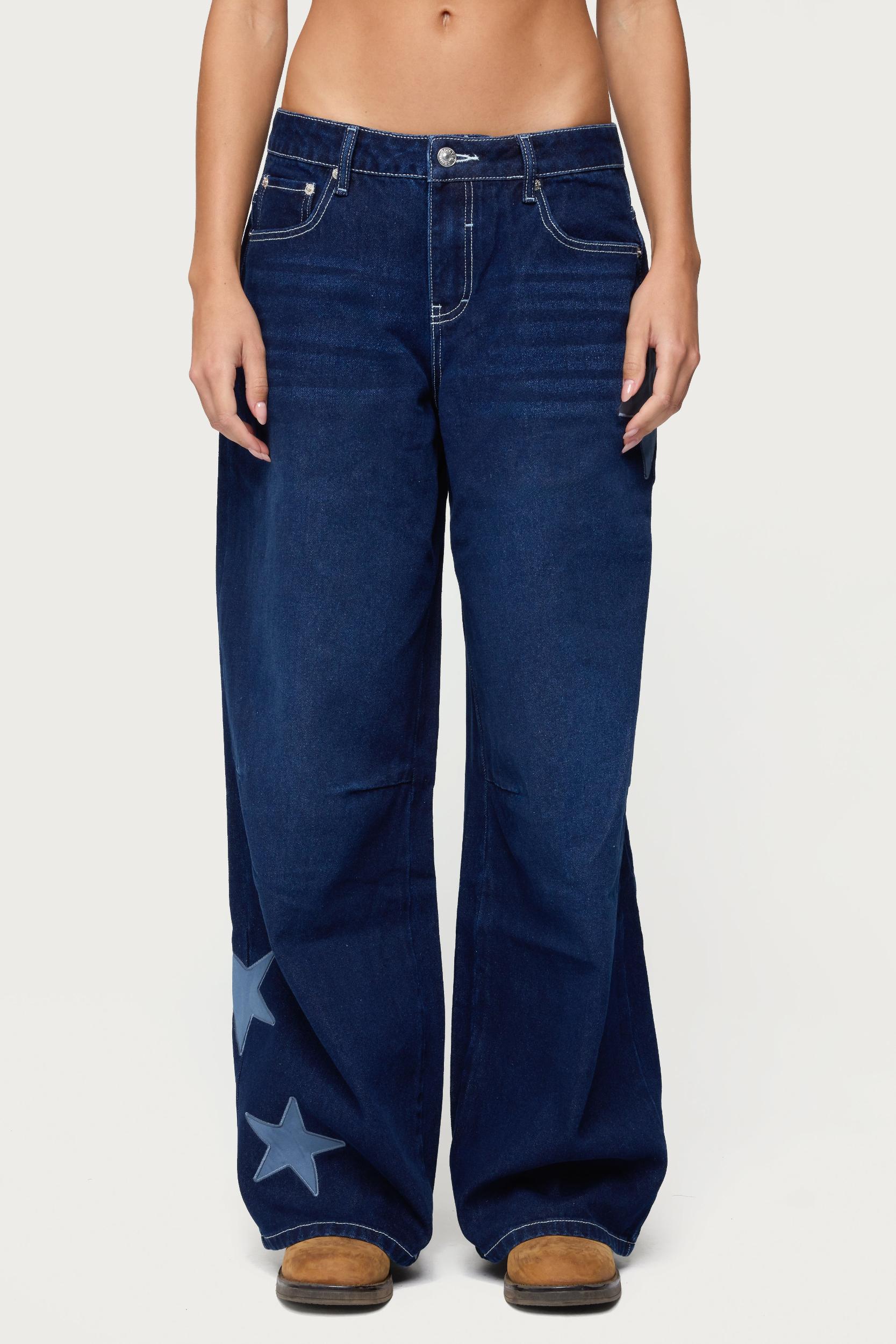 Jeans Low rise waist Baggy fit Embroidered satin effect star patches Rigid denim fabric Cotton, Polyester, Rayon Model wears size S Inseam of size S (in): 31.3 Model height is 5'8 Item care: Machine wash at maximum 30ºC, wash with similar colors, do not bleach, do not tumble dry, iron at a maximum of 110ºC, do not dry clean